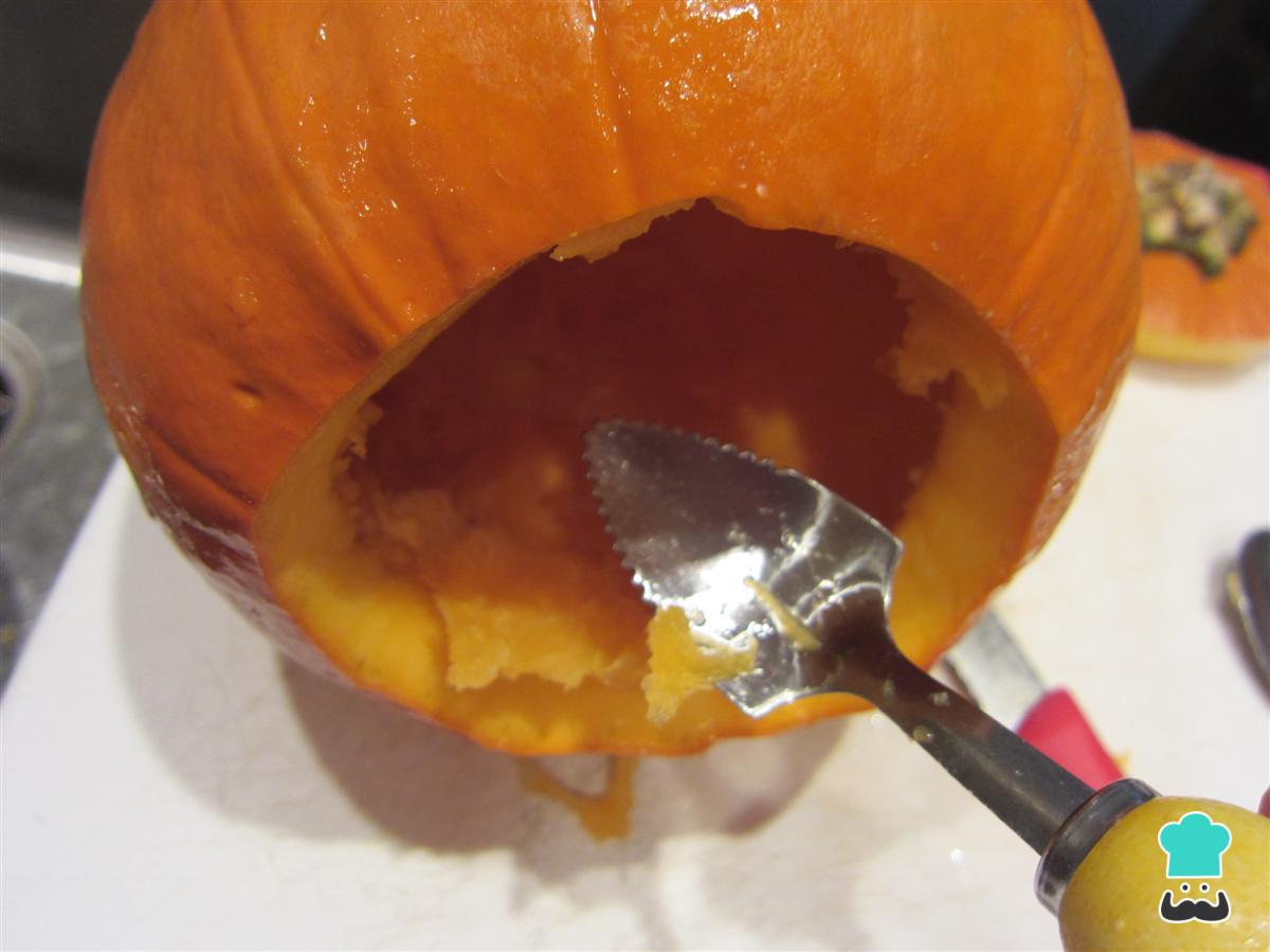 Comece por limpar bem a superfície da abóbora. Se estiver cortada em pedaços, descasque-a e elimine a polpa. Caso esteja trabalhando com uma abóbora inteira, use-a assim mesmo.