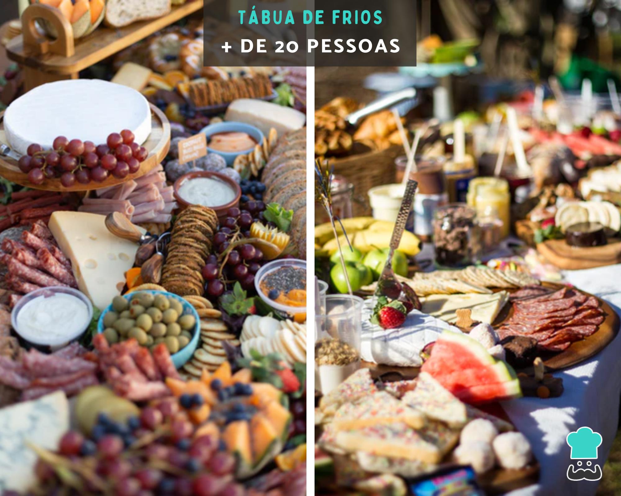 No caso da tábua de frios para 20 pessoas ou mais, vale se ater a opções além dos queijos e ultrapassar os limites da tábua, que nem sempre comporta tanta comida assim. Isso não impede uma apresentação caprichada, como mostra a foto.