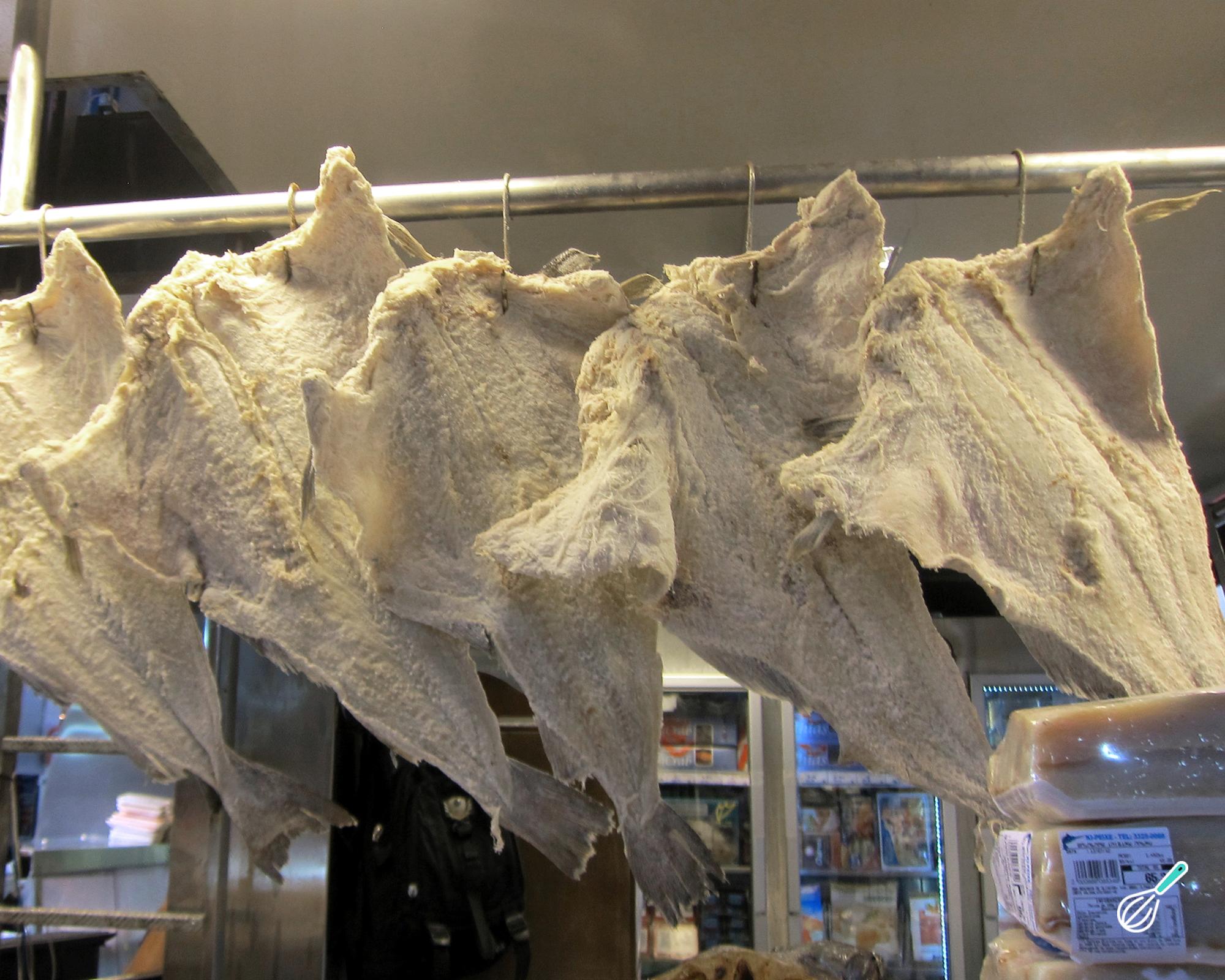 - Quando seco e salgado o bacalhau tem coloração cor de palha e uniforme. Evite comprar bacalhau muito branco.