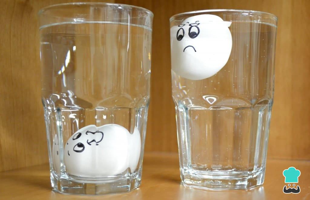 - Um ovo fresco (bem cheio) afundará na água, batendo no fundo do copo na horizontal.