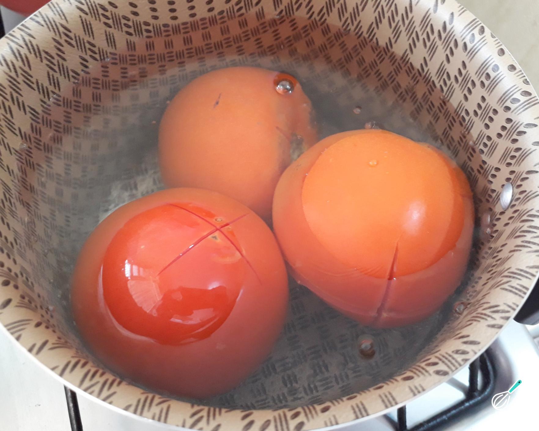 - Coloque os tomates na água fervente e deixe por 1-2 minutos, ou até você observar que a pele começou a soltar;
