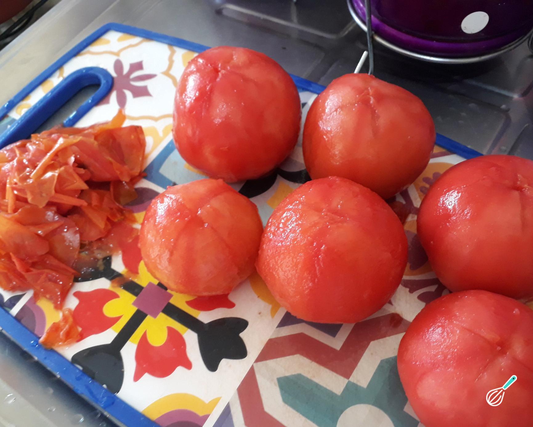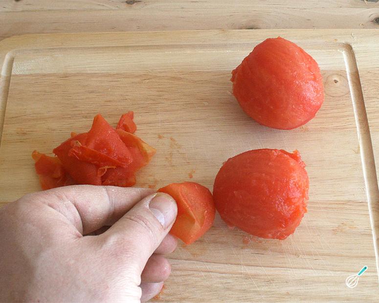 - Escorra os tomates e puxe a pele, que deverá soltar facilmente.