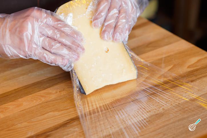 - Envolva o pedaço de queijo em filme plástico e depois com papel de alumínio ou, se preferir, coloque num saco com fecho;