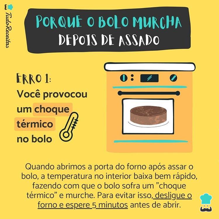 Para que um bolo asse do jeito correto, o ideal é ter assar a 180ºC no forno preaquecido (algumas receitas indicam também para assar a 200ºC). Mas, no momento em que abrimos o forno para fazer o teste do palito, por vezes observamos o bolo a baixar logo. Porque acontece isso? Simples: na maioria dos casos o bolo murcha porque existe uma grande diferença entre a temperatura no interior do forno e a temperatura ambiente, que está mais fria, provocando assim um choque térmico na massa do bolo.