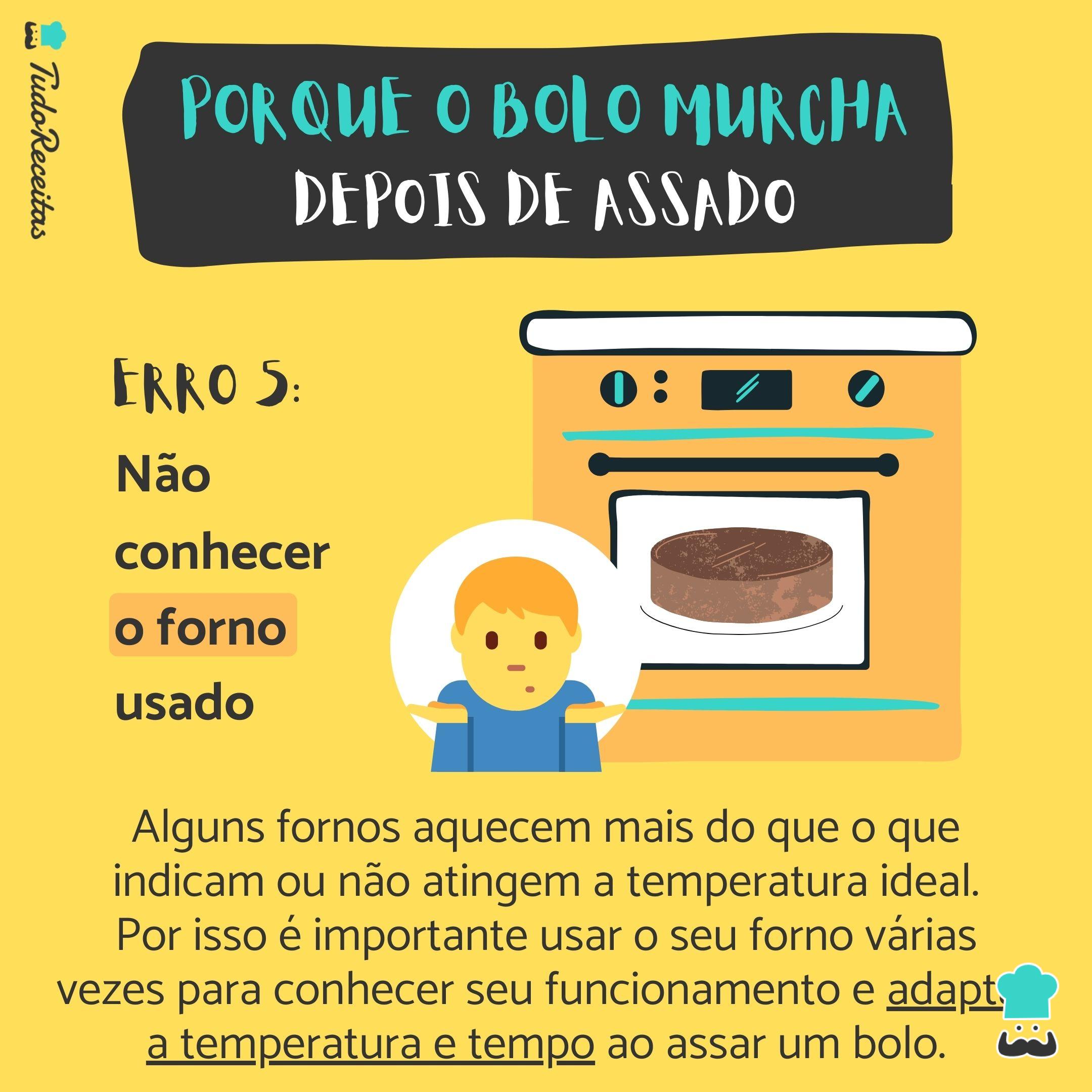 Muitas vezes, terminado o tempo indicado na receita, o bolo parece estar pronto mas, no interior, a massa ainda está mole. Esse é um dos maiores erros ao preparar um bolo e que explica porque o bolo murcha e sola quando sai do forno. Isso pode acontecer por várias razões: os ingredientes usados demoram mais para assar, a forma de bolo não permite que o bolo asse no tempo indicado, o bolo não está bem posicionado no interior do forno, entre outros pormenores. No entanto, regra geral, isso acontece porque a temperatura do forno está muito alta, fazendo com que o bolo asse rapidamente no fundo, laterais e topo e continue cru no interior.