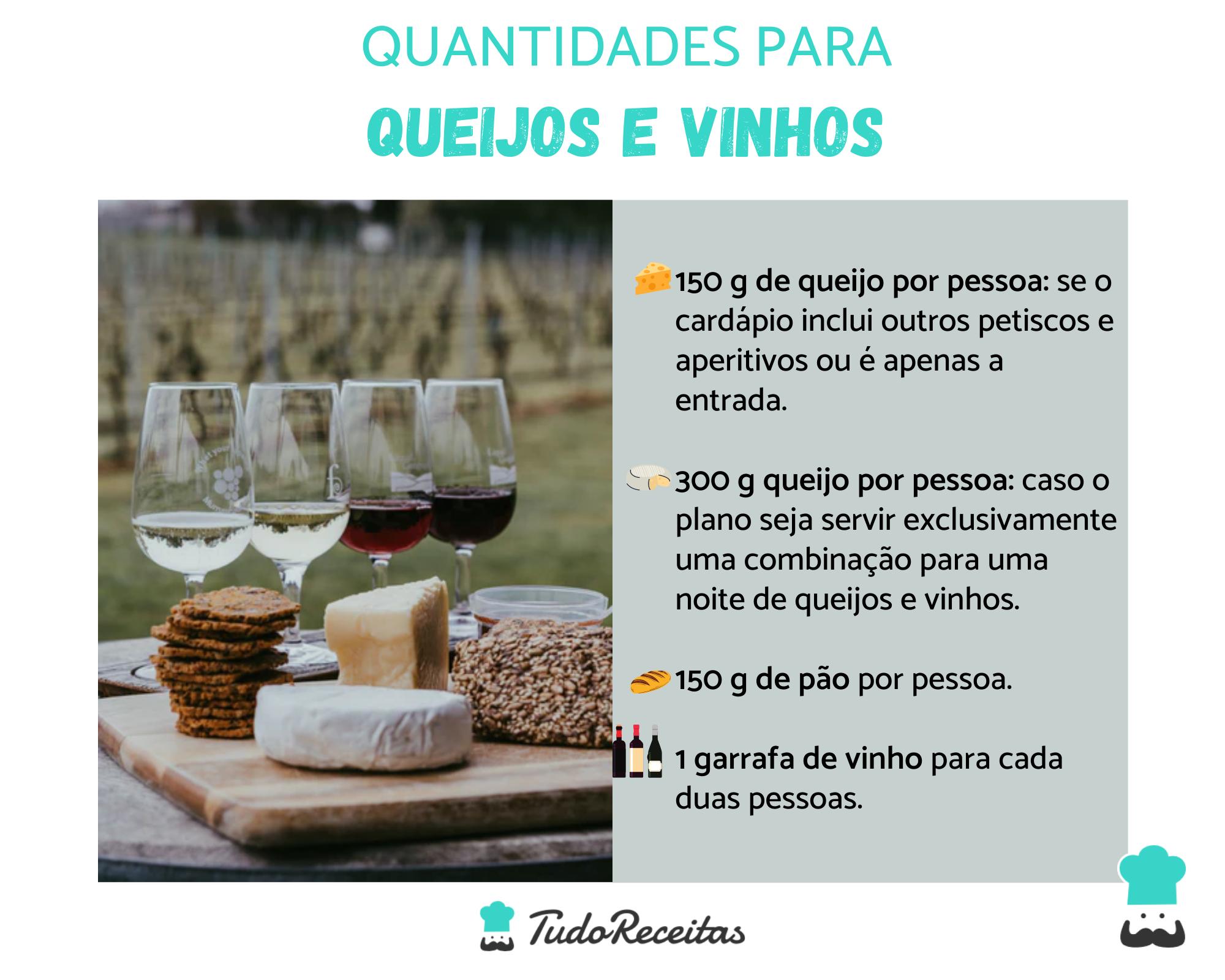 - 300 g queijo por pessoa: caso o plano seja servir exclusivamente uma combinação para uma noite de queijos e vinhos;