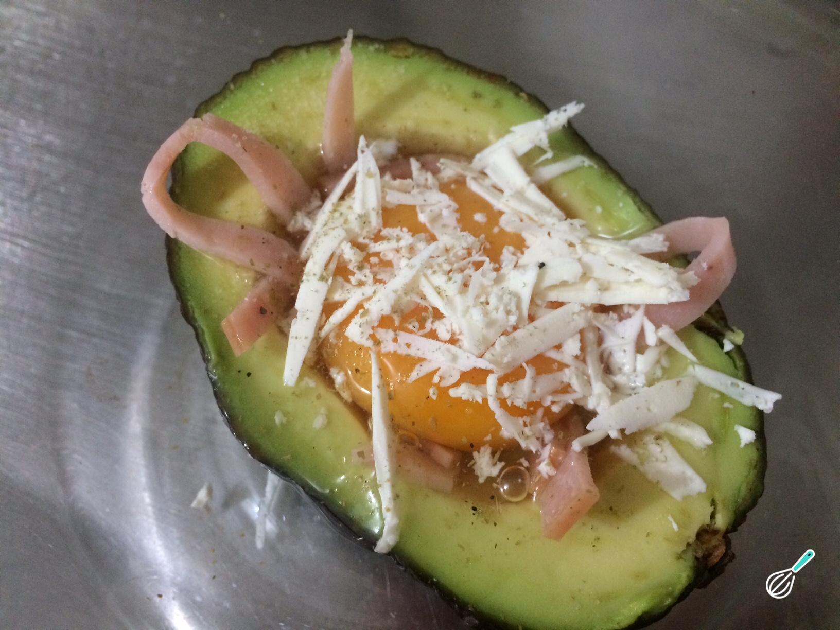 Para rechear o abacate, comece por colocar o ovo inteiro no centro, corte tiras de presunto e disponha por cima do ovo. Tempere com sal e pimenta e adicione o queijo ralado. Leve ao forno a 180° C por 12 minutos até que a gema coza e fique suave.