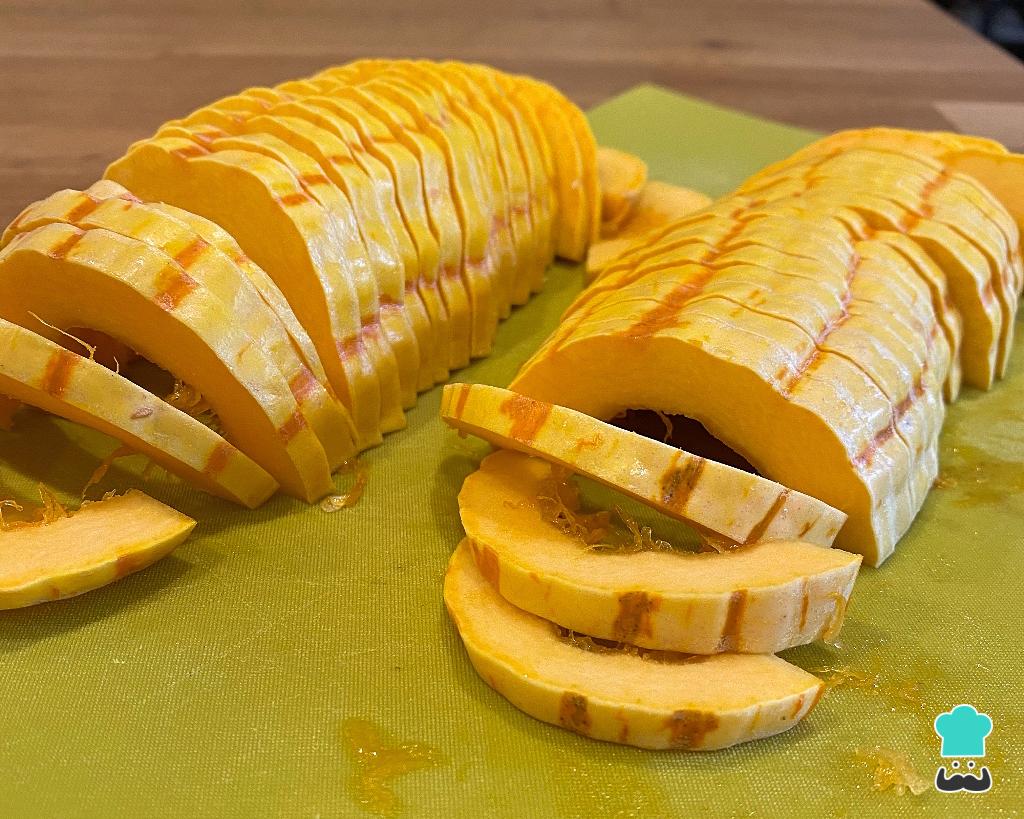 Corte sua abóbora ao meio, retire as sementes e corte em meia lua, como na foto. A espessura seria algo entre meio e 1 centímetro.