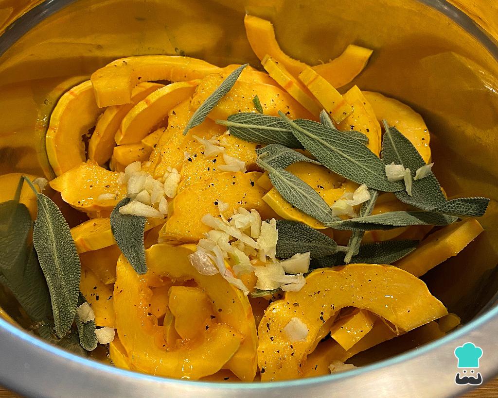 Coloque a abóbora numa vasilha e junte os outros ingredientes (alho, sálvia, azeite, ghee, sal e pimenta). Mexa bem para as abóboras ficarem todas cobertas com essa mistura de temperos.