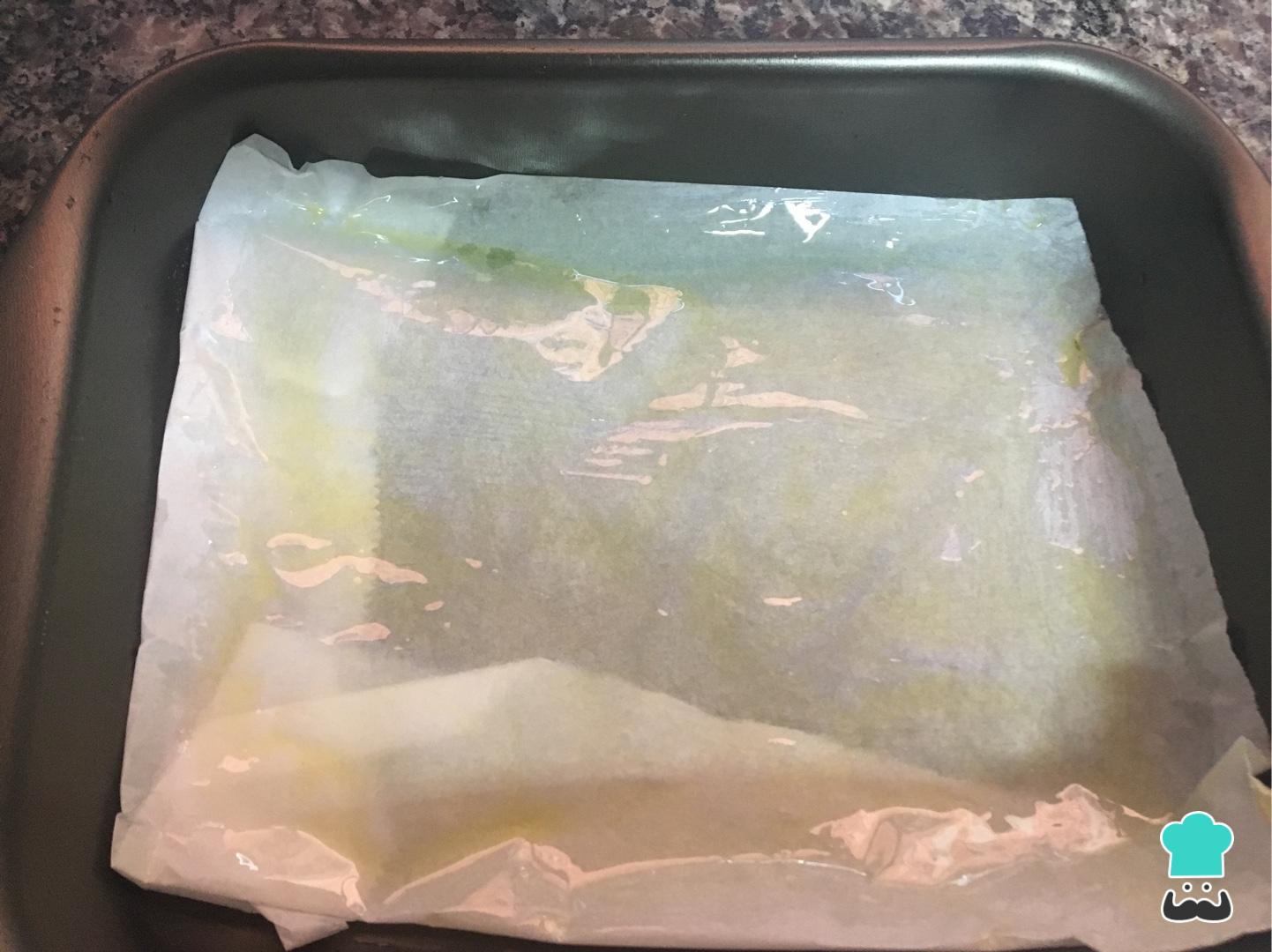 Pegue uma forma de bolo retangular ou assadeira, coloque papel manteiga e jogue um fio de azeite para não grudar.