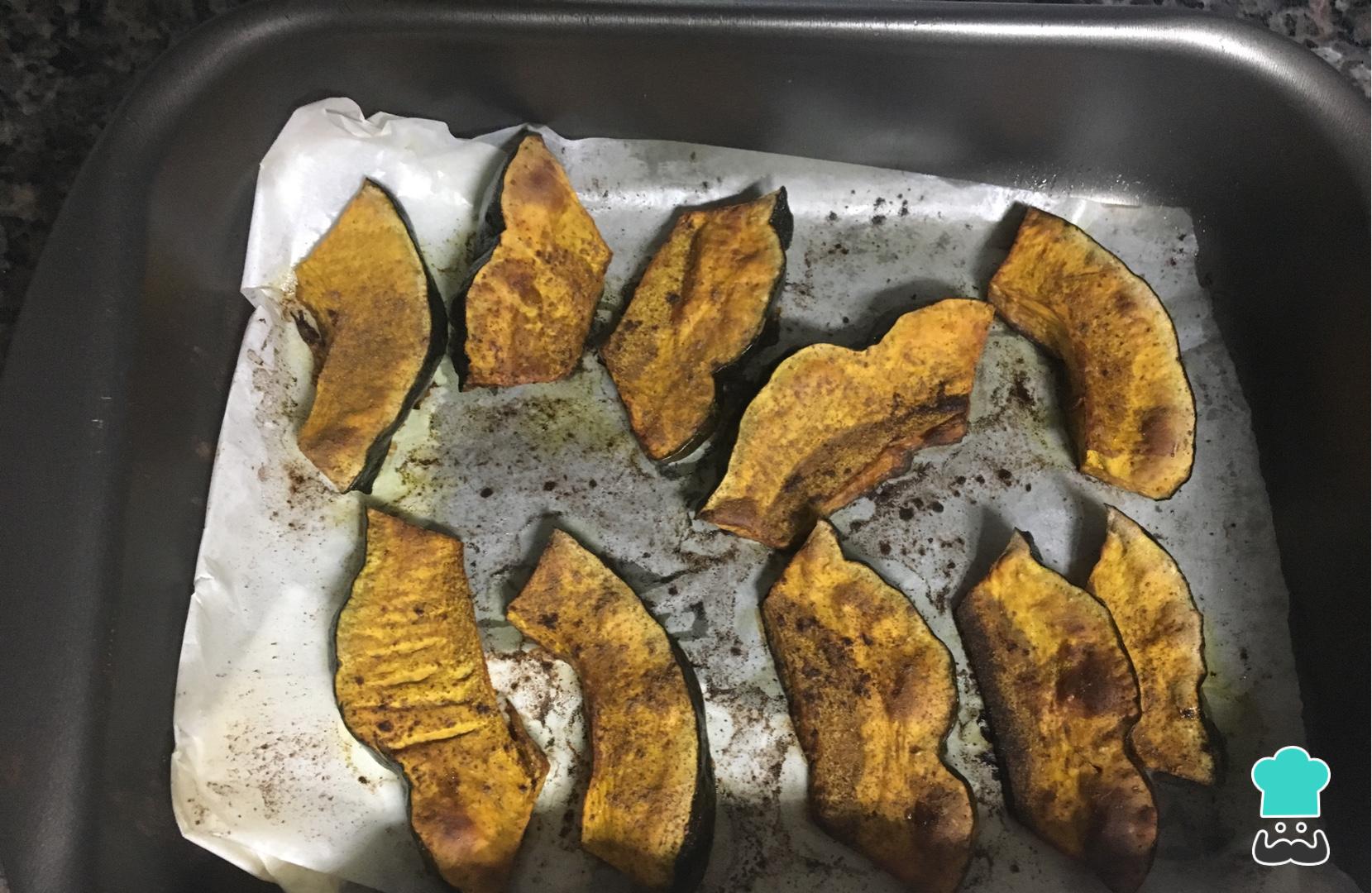 Lave a abóbora, tire as sementes e corte em fatias de 1 dedo de espessura com a casca mesmo.