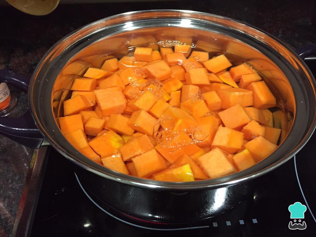 Corte a abóbora em pedaços e coloque em uma panela com sal. Cozinhe por cerca de 5 minutos.