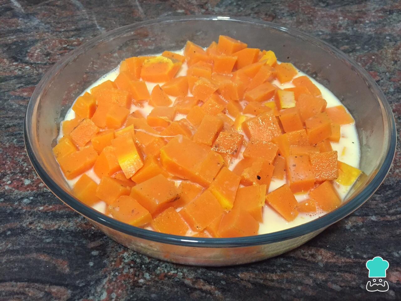 Separadamente, bata os ovos juntamente com o leite. Uma vez misturados, despeje sobre a abóbora.