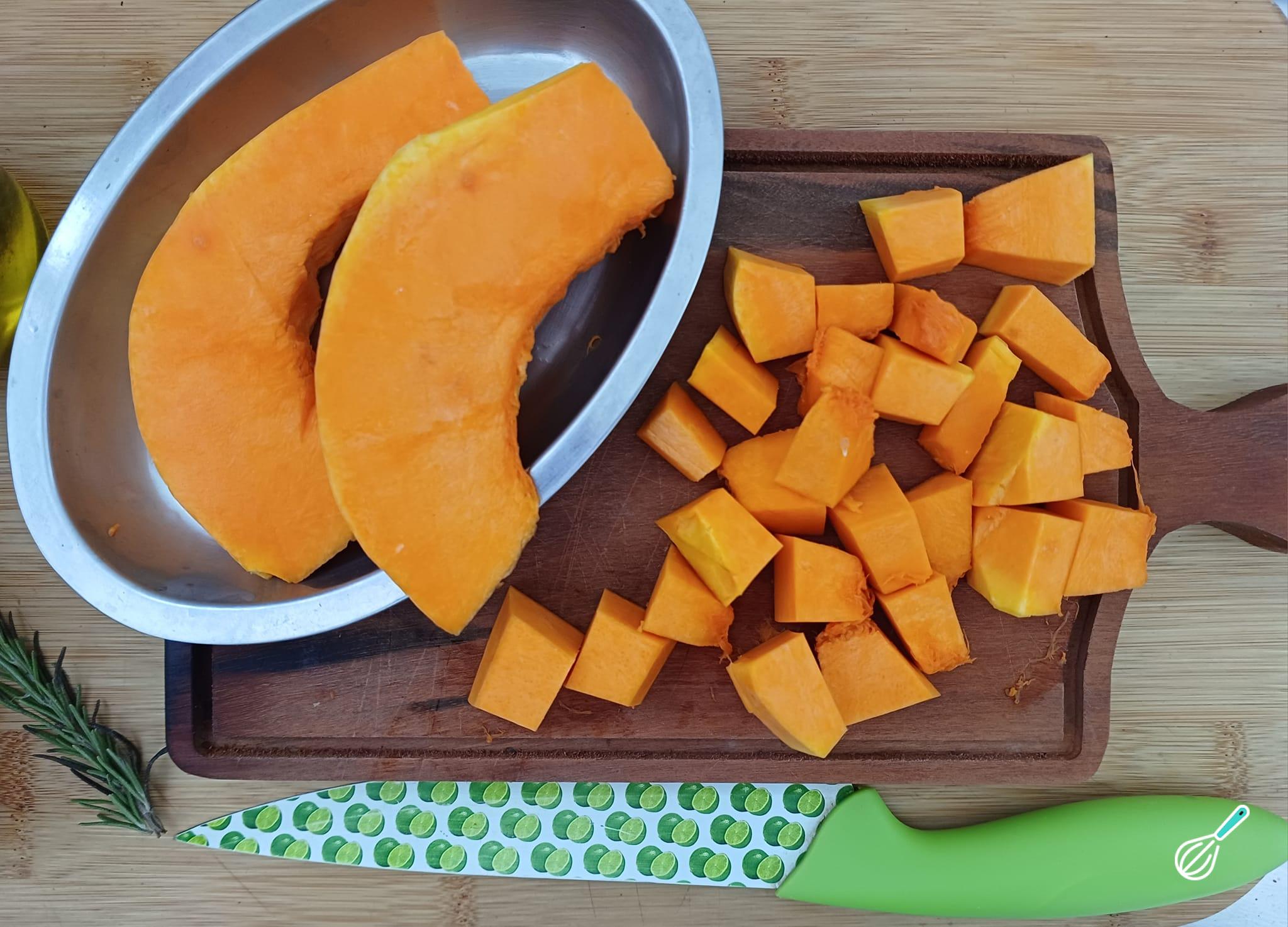 Primeiro corte a abóbora em cubinhos, sem a casca.