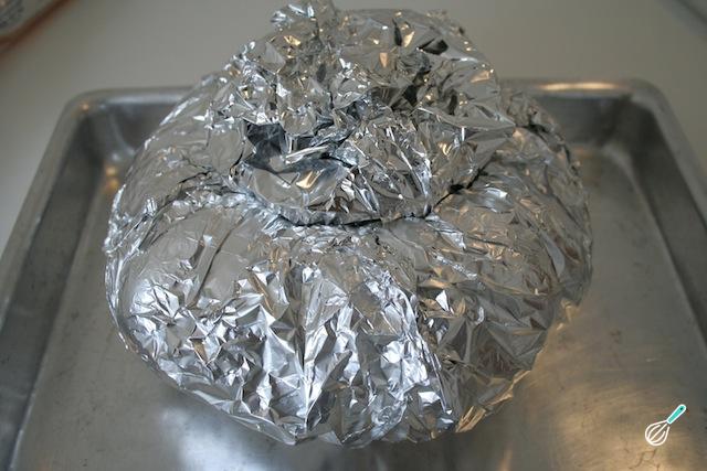 Salgue ligeiramente a parte de dentro da moranga e pincele azeite no interior e exterior. Embrulhe-a em papel alumínio e leve para assar no forno a 200ºC durante 40 minutos a 1 hora, até que esteja bem macia por dentro.