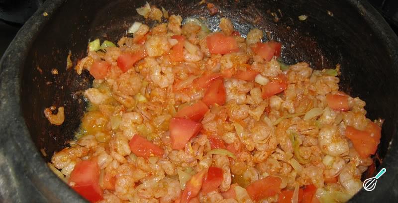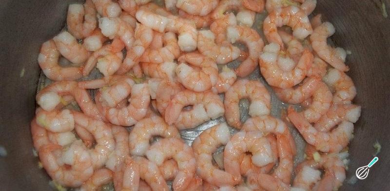 Enquanto isso prepare o recheio do seu camarão na moranga: descasque os camarões, com exceção de 6, e coloque-os refogando a fogo médio em uma panela com o azeite, a cebola e os alhos picados.