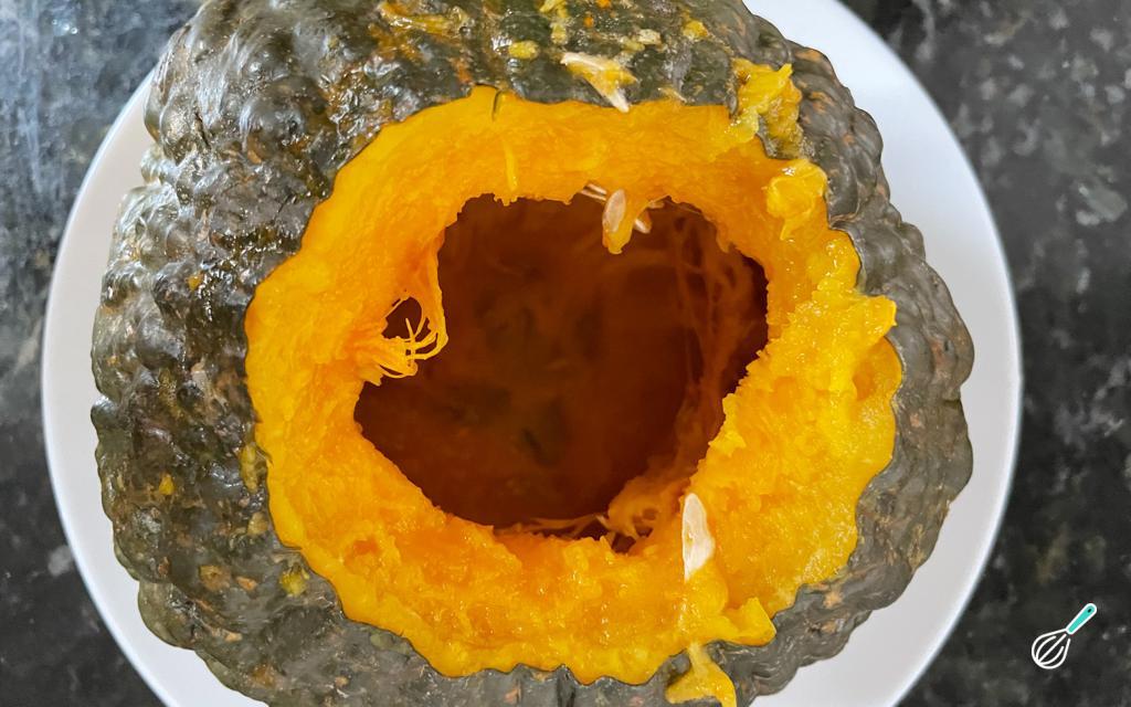 Corte a tampa da abóbora cabotiá e retire todas as sementes.