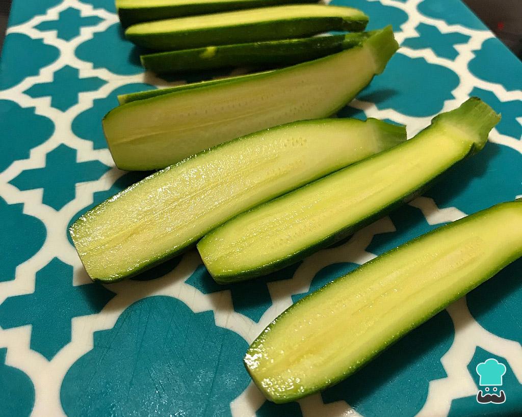 Corte as mini abobrinhas ao meio, como na foto. Se usar a abobrinha normal corte em rodelas não muito finas nem muito grossas (o ideal é entre 2 a 3 mm).