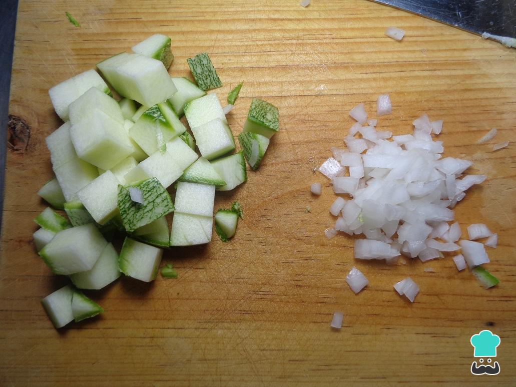 Separadamente, pique finamente o resto da cebola. Corte a abobrinha em cubos pequenos de aproximadamente 1 cm de cada lado.