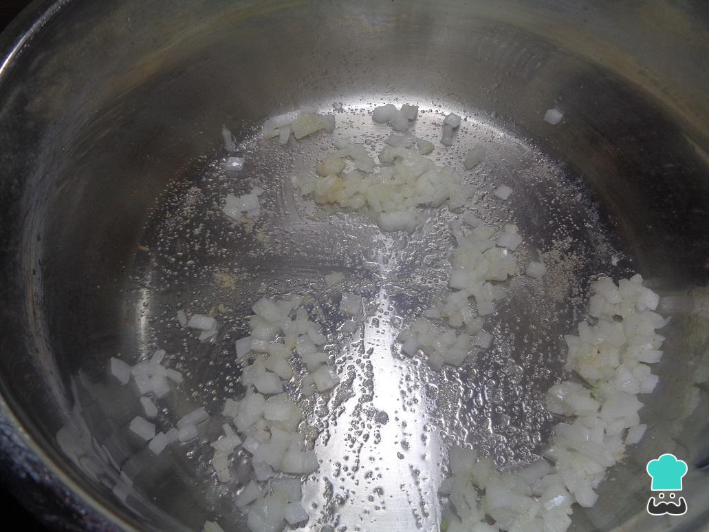 Aqueça um pouco de óleo em uma panela, e quando estiver quente, adicione a cebola, juntamente com uma pitada de sal e o alho. Deixe refogar até ficar transparente.