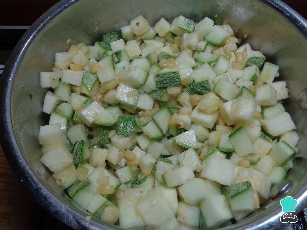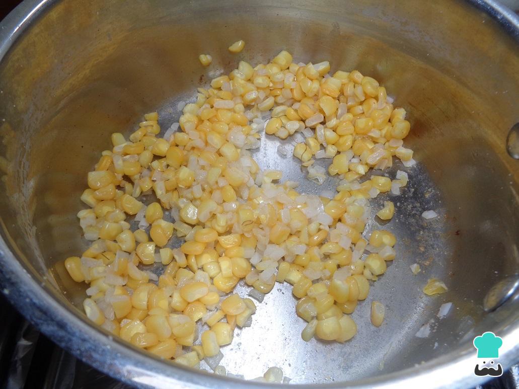 Depois de refogar a cebola, adicione os grãos de milho cozido e frite por cerca de 10 minutos.
