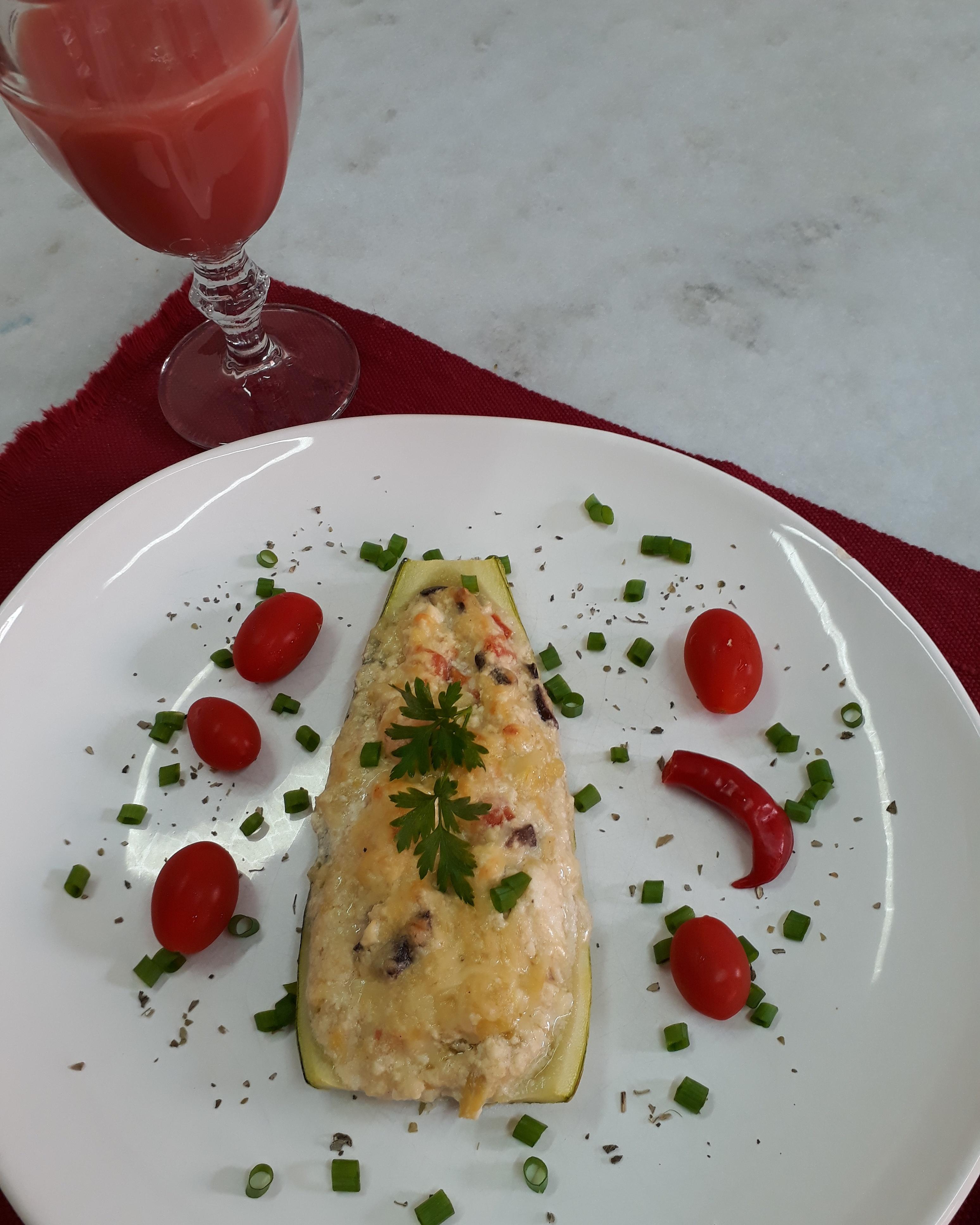 Dica: Se desejar, adicione as azeitonas antes de levar a abobrinha recheada ao forno.