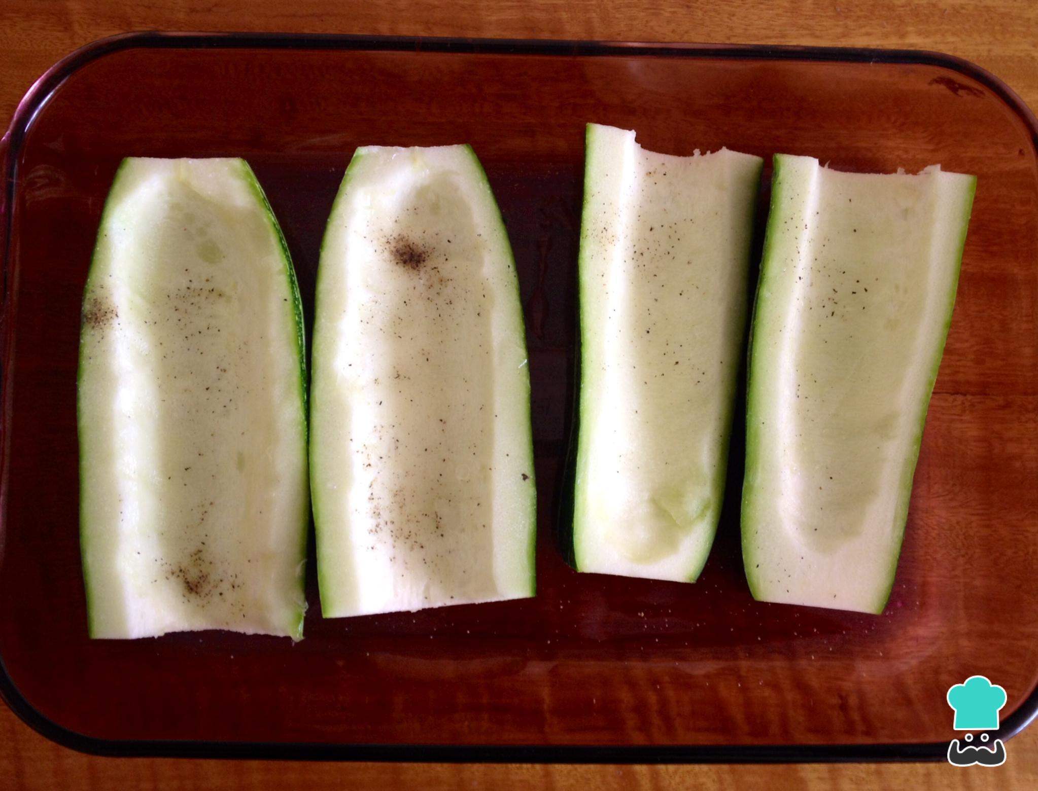 Para fazer abobrinha com ricota no forno, comece por cortar as abobrinhas no sentido horizontal. Use uma colher para retirar o miolo e reserve a polpa. Coloque a abobrinha com casca em uma panela com água fervente e sal e cozinhe até ficarem macias.
