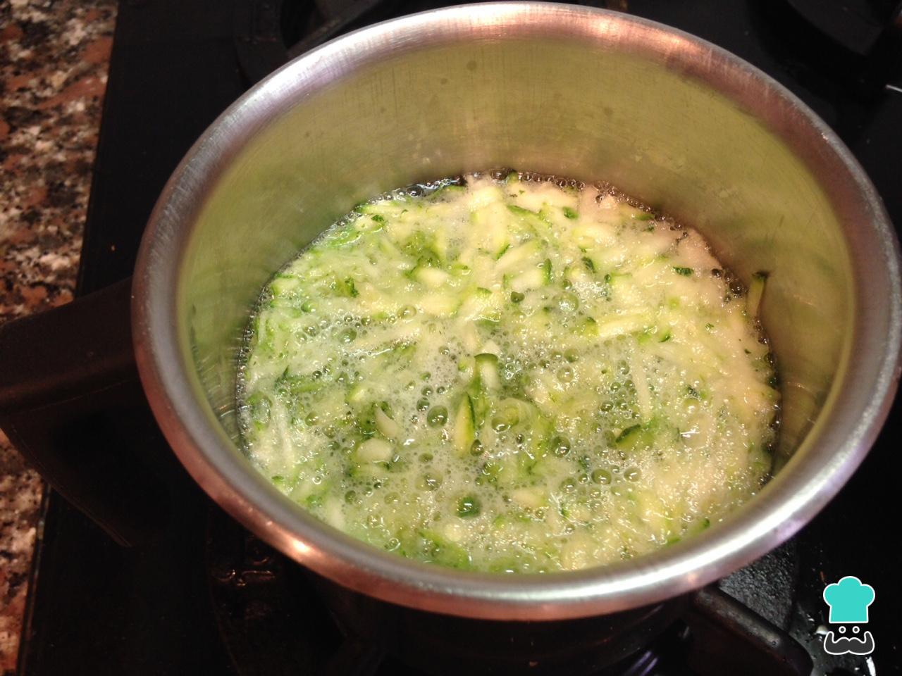 Coloque a cebola ralada, a polpa das abobrinhas, metade do leite, o tomate picado e o alho amassado em uma panela. Deixe cozinhar por uns minutos e junte a ricota. Tempere com pimenta do reino e sal.