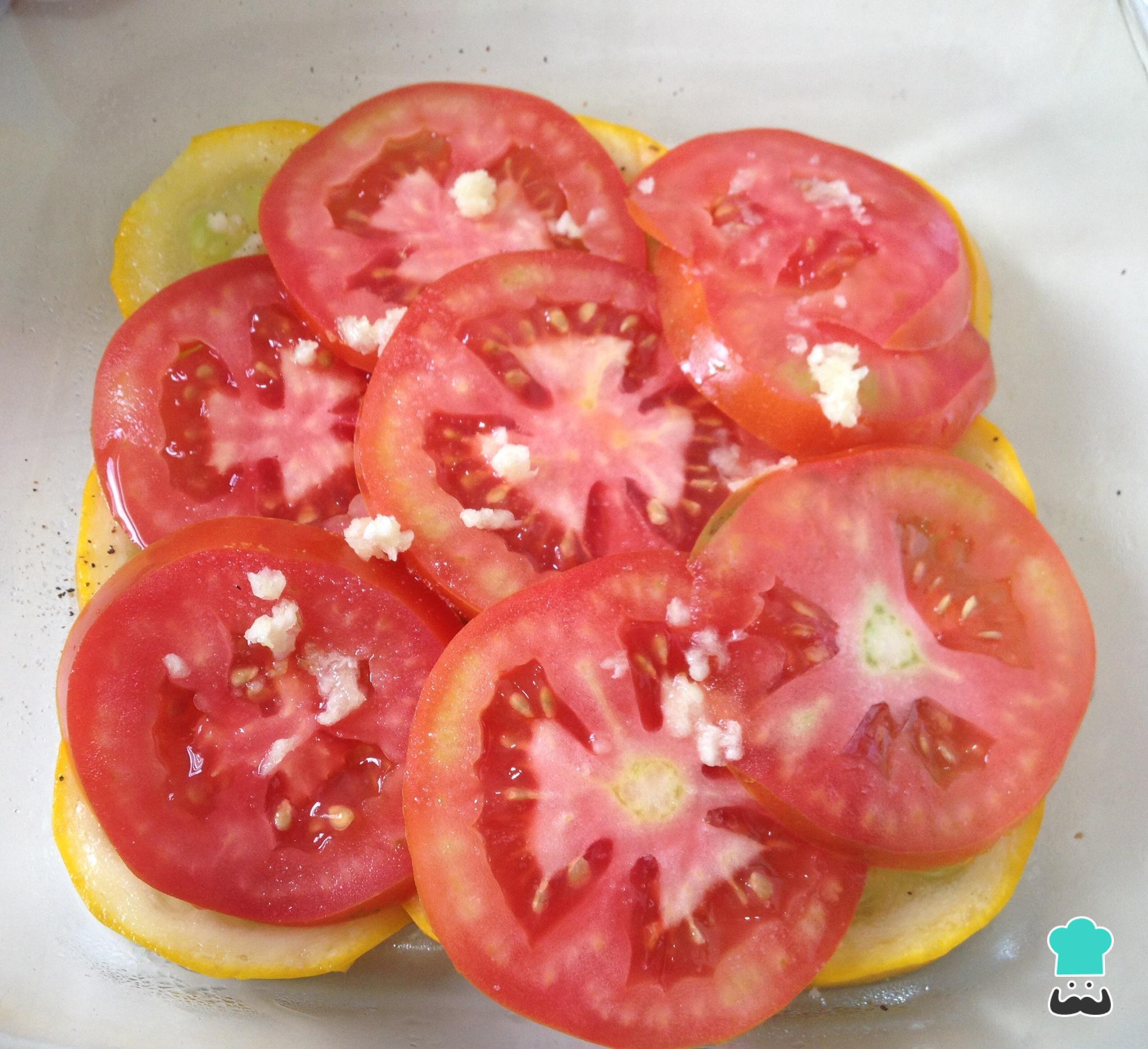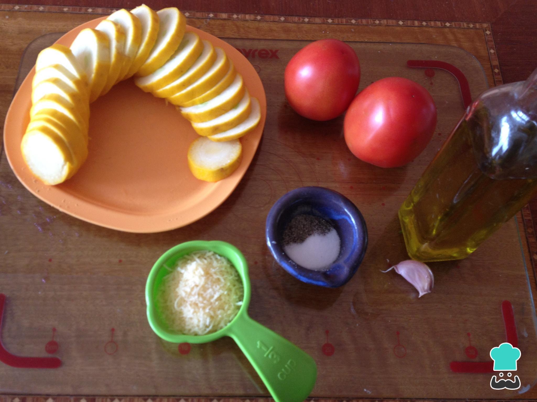 Prepare todos os ingredientes para fazer a sua receita de abobrinha e tomate assados!