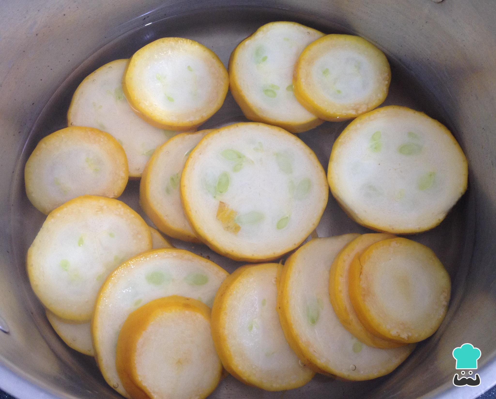 Corte a abobrinha em fatias e coloque em uma panela com água fervente e sal. Cozinhe por 5 minutos.