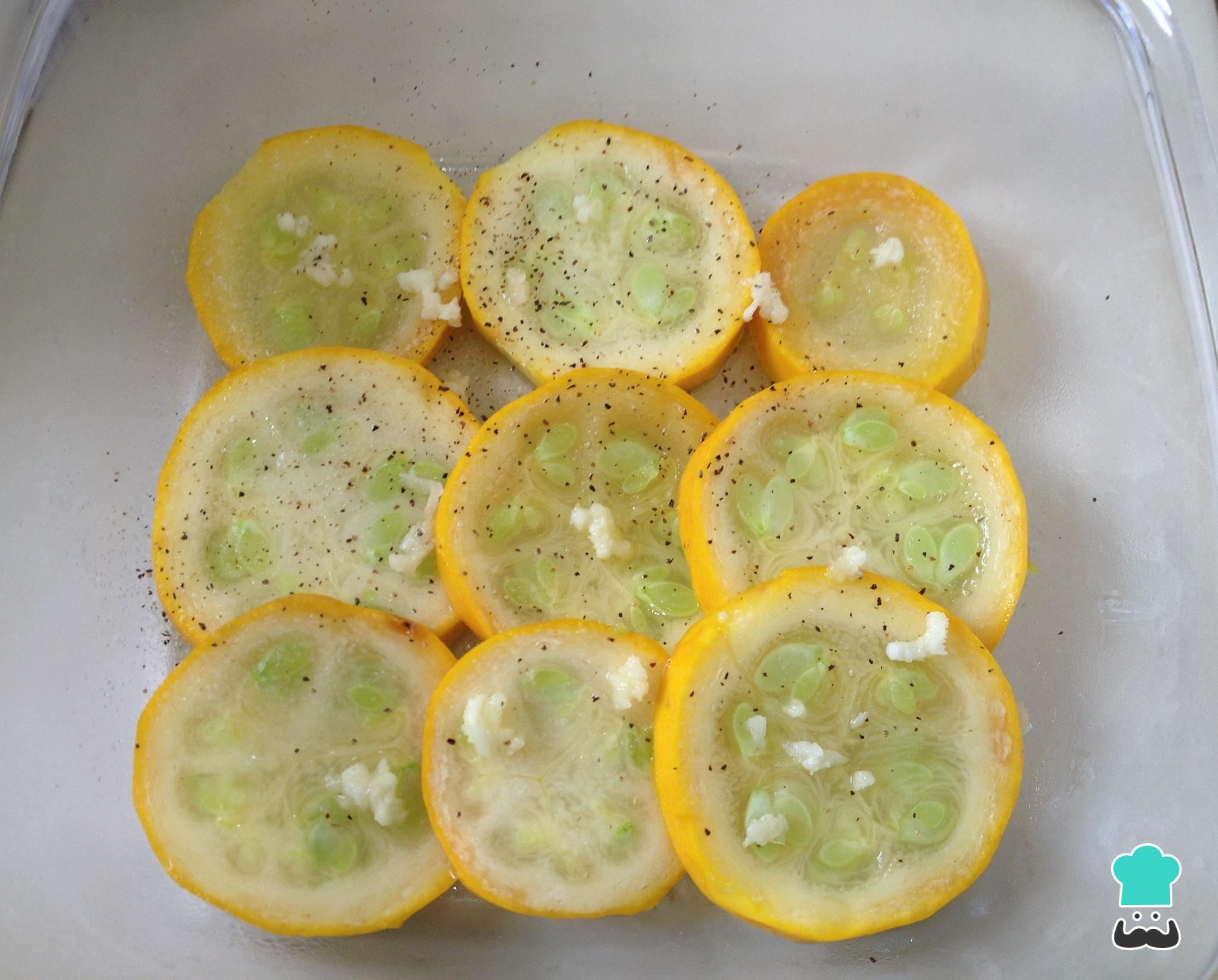 Em um refratário disponha a abobrinha, tempere com sal e pimenta e adicione metade do alho esmagado.