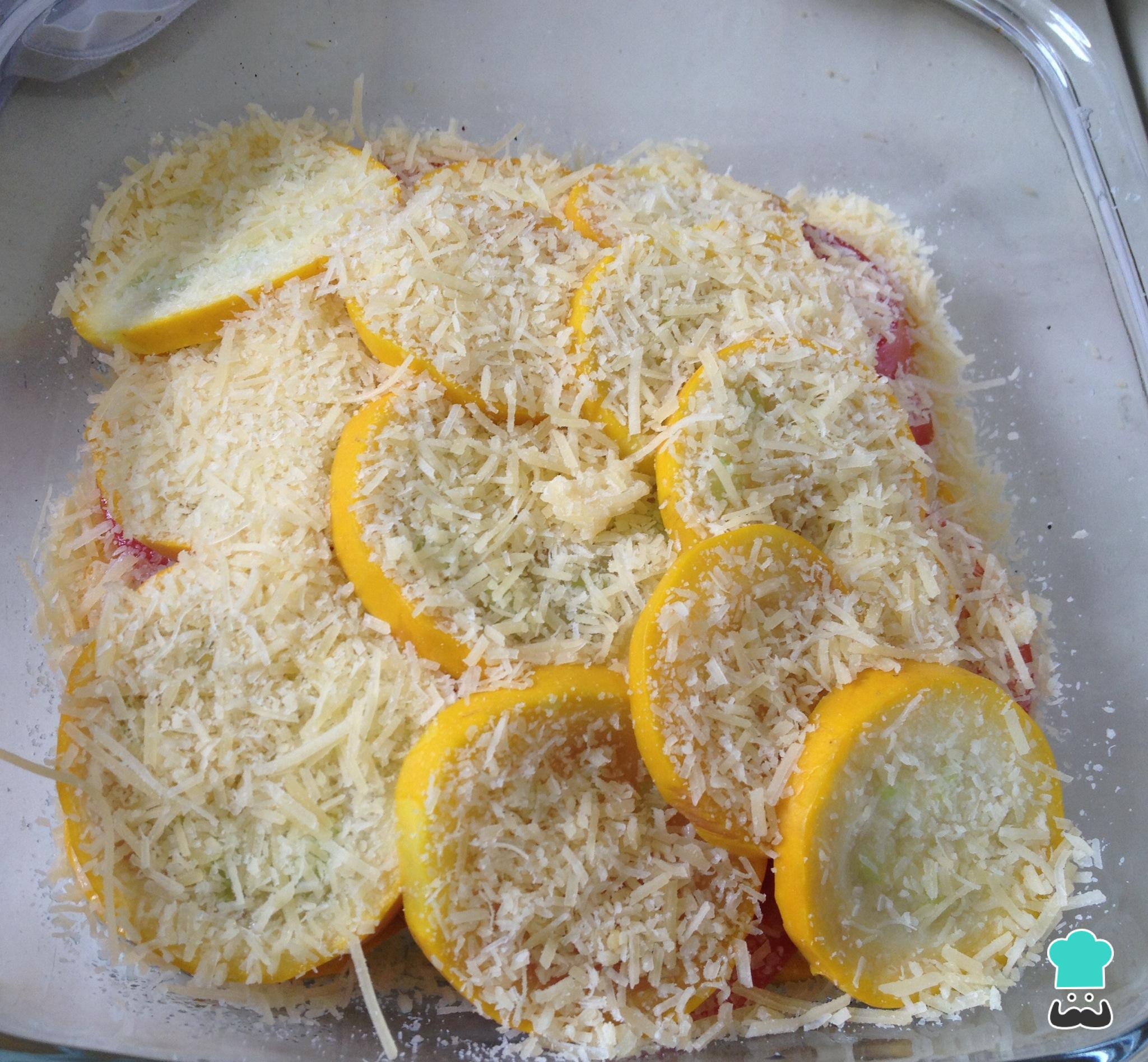 Termine com uma segunda camada de abobrinha temperada com sal e pimenta. Regue com azeite e polvilhe o queijo. Leve a assar no forno a 200ºC por 15 minutos.