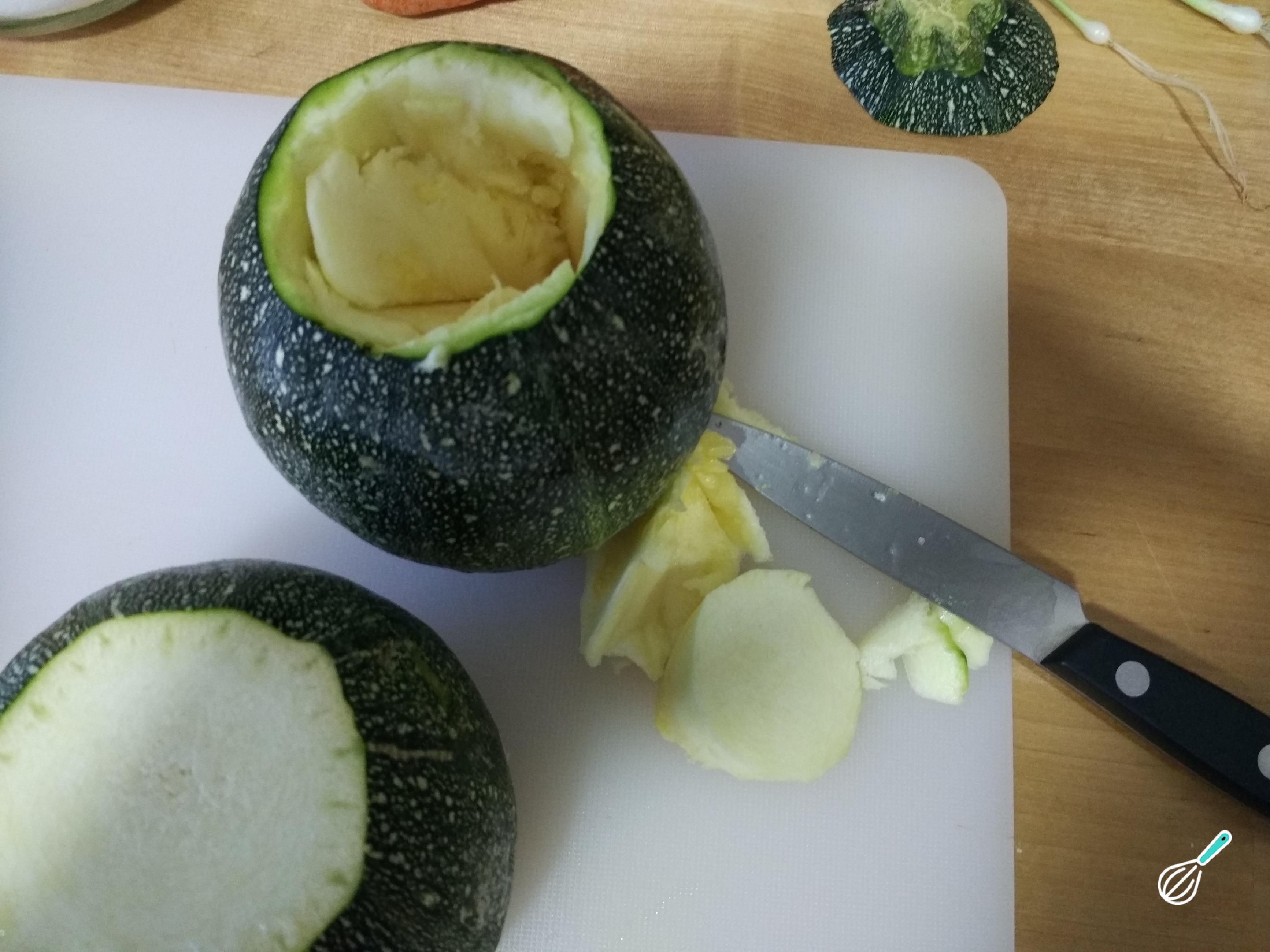 Primeiro, corte a parte superior da abobrinha italiana e retire o seu interior com a ajuda de uma faca e de uma colher de sopa. Reserve o interior e coloque a abobrinha no forno 180 ºC durante 10-12 minutos.