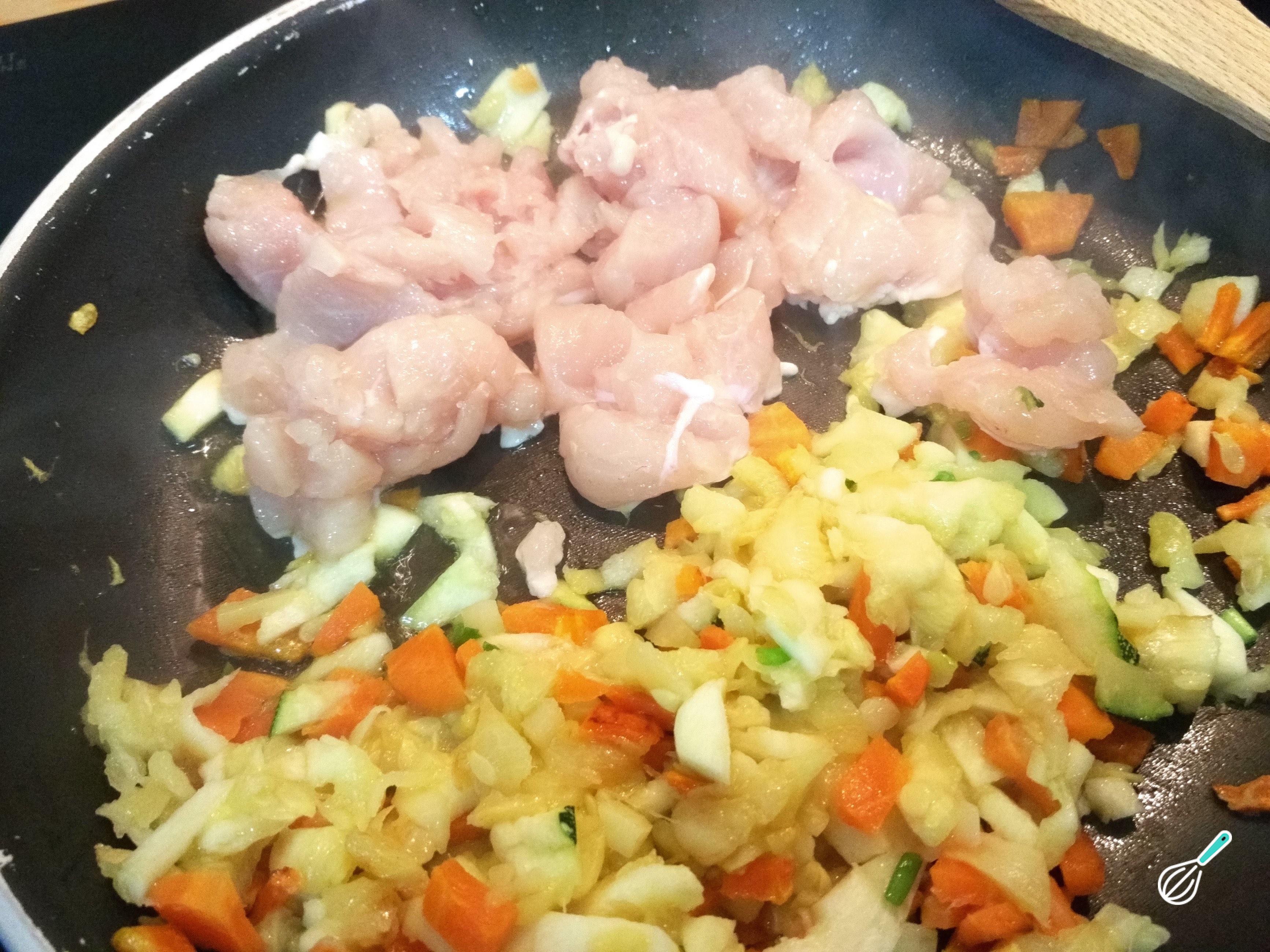 Enquanto isso, prepare o recheio. Refogue a cenoura, cortada em pequenos cubos, em uma frigideira com um pouco de azeite. Em seguida, adicione o interior da abobrinha finamente picada e deixe cozinhar por uns minutos. Junte o peito de frango cortado em pedaços pequenos, tempere com sal e pimenta do reino e deixe cozinhar por mais 3 minutos.