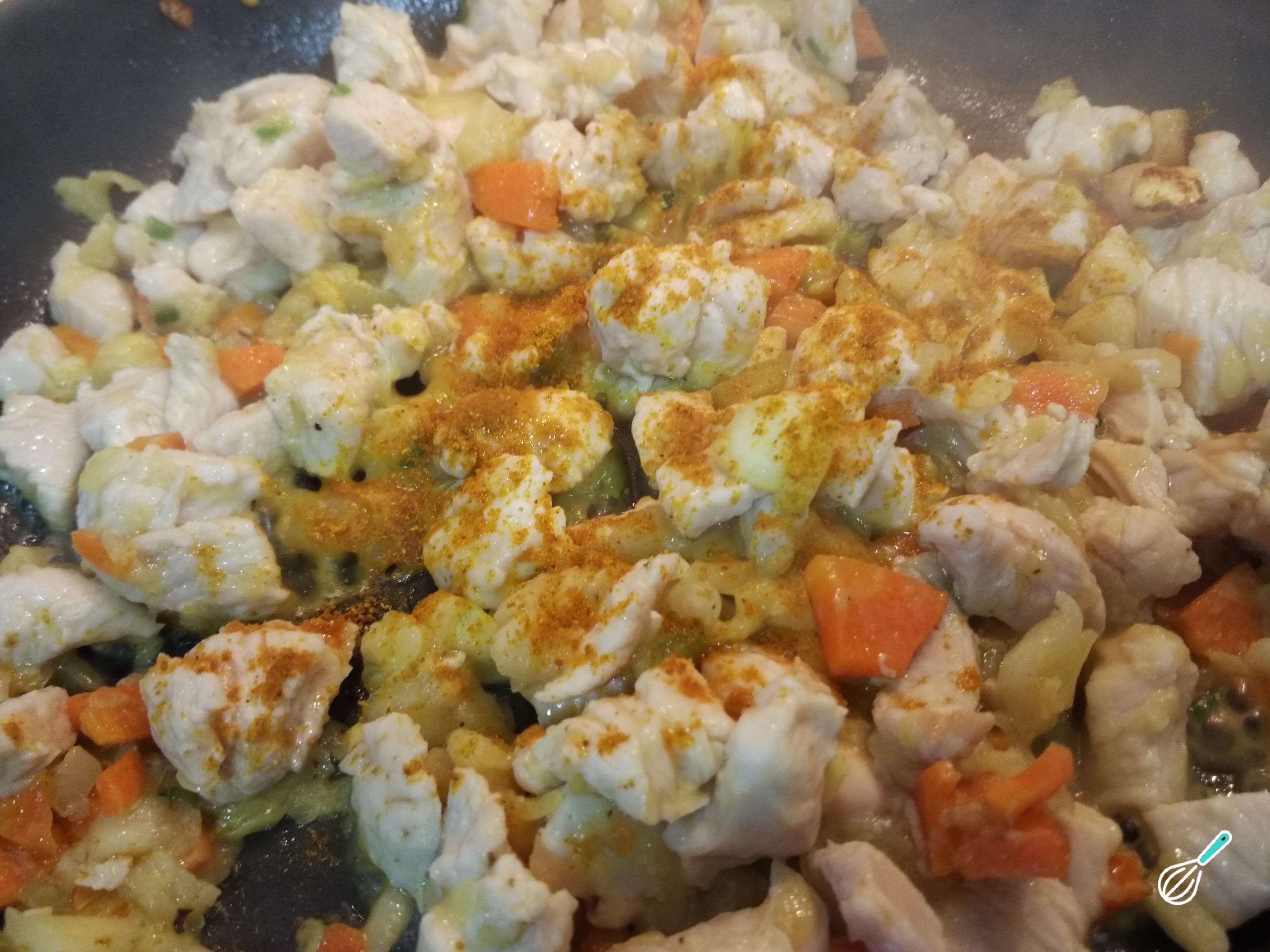Adicione agora uma colher de chá de curry em pó, misture bem e deixe cozinhar por mais alguns minutos.