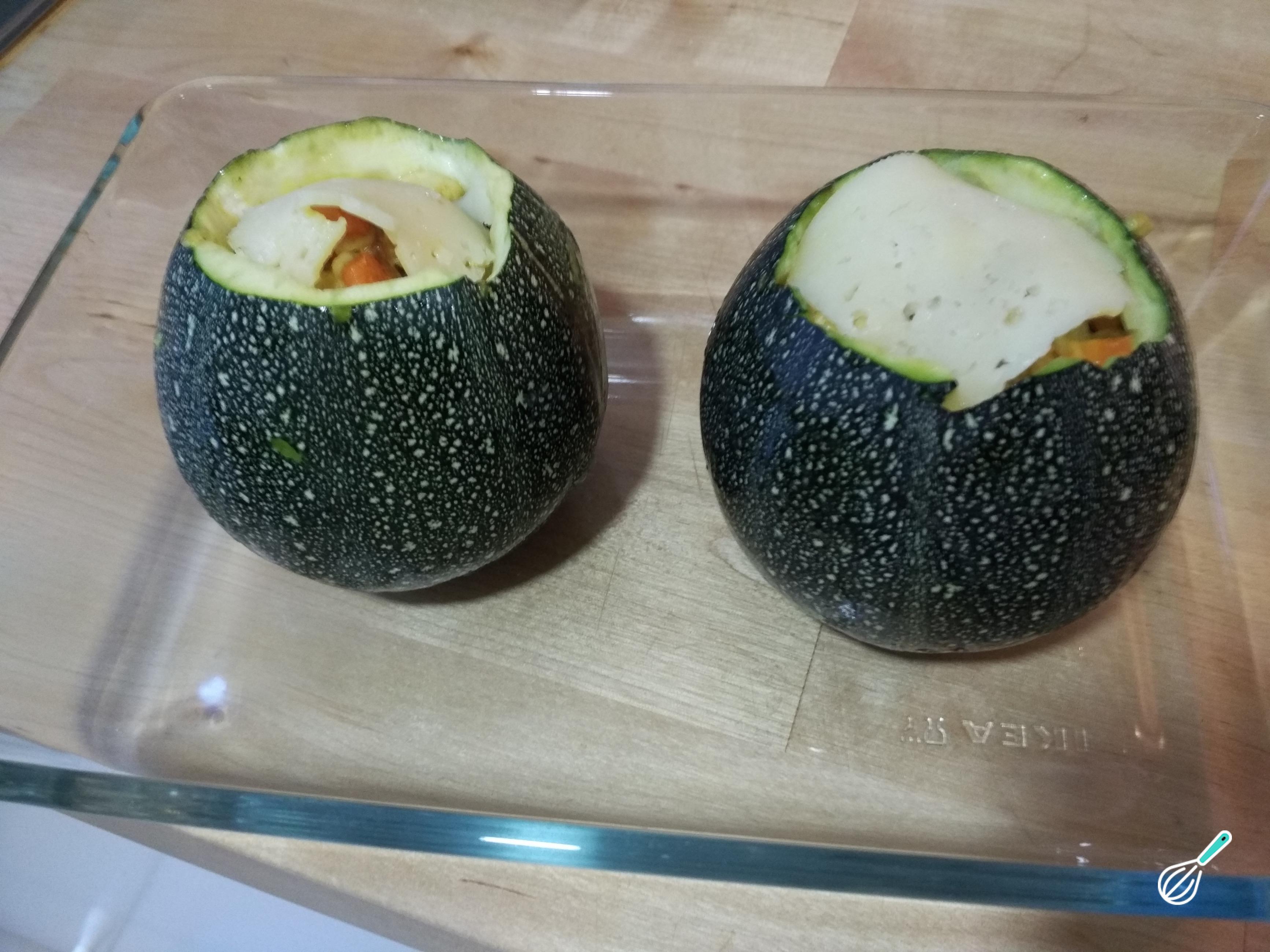 Quando as abobrinhas italianas estiverem prontas, retire do forno e recheie-as com o frango com curry e legumes.