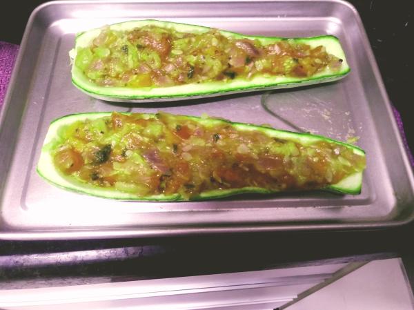 Retire a pele da abobrinha do forno e recheie com legumes. Volte a colocá-la no forno para terminar o cozimento, cerca de 5 minutos.