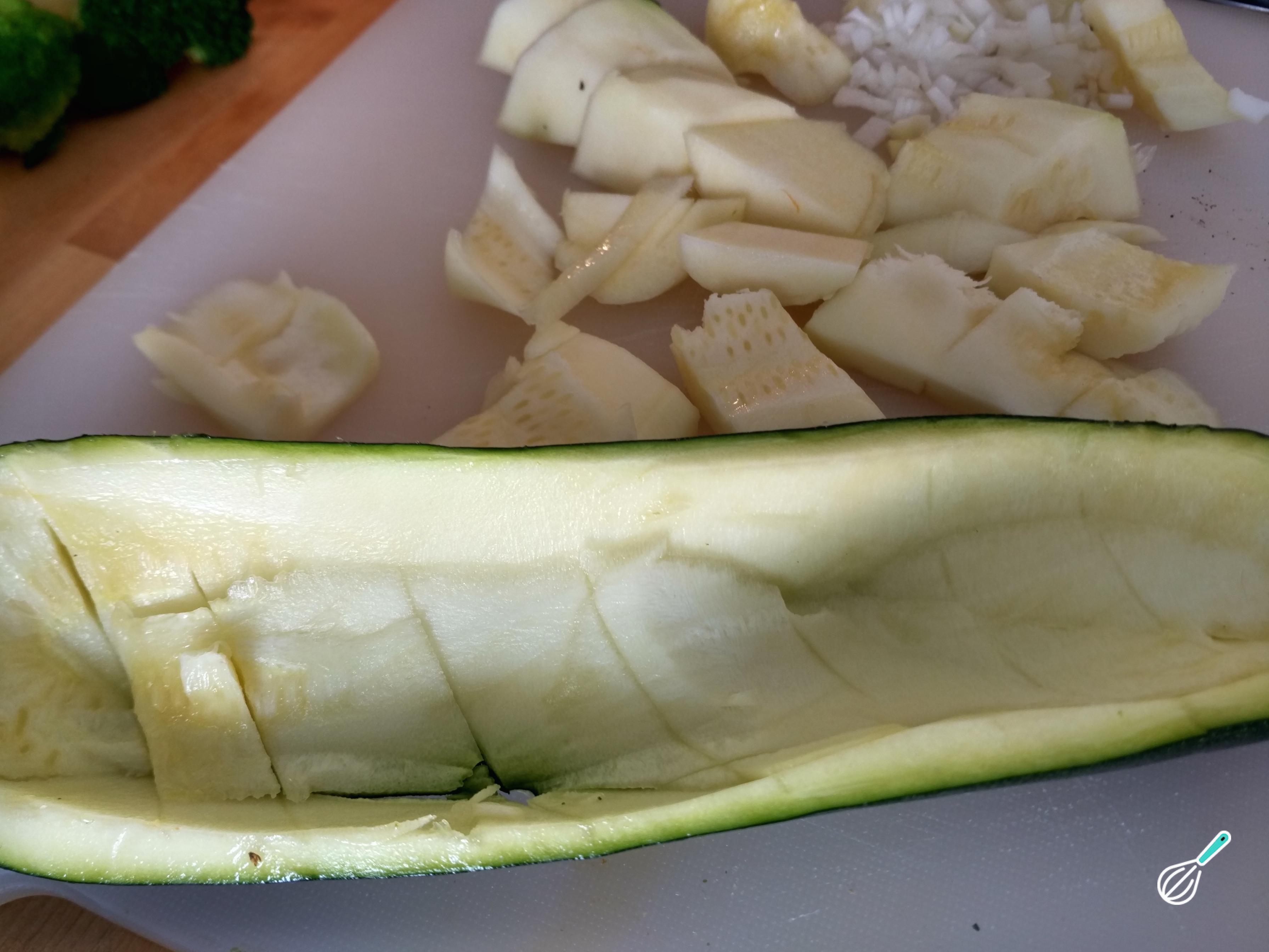 Primeiro, corte a abobrinha ao meio e esvazie o seu interior, removendo a polpa com cuidado para não quebrar a pele. Coloque um pouco de sal e azeite em cada metade e leve ao forno a 180 ° C enquanto prepara o resto da receita.