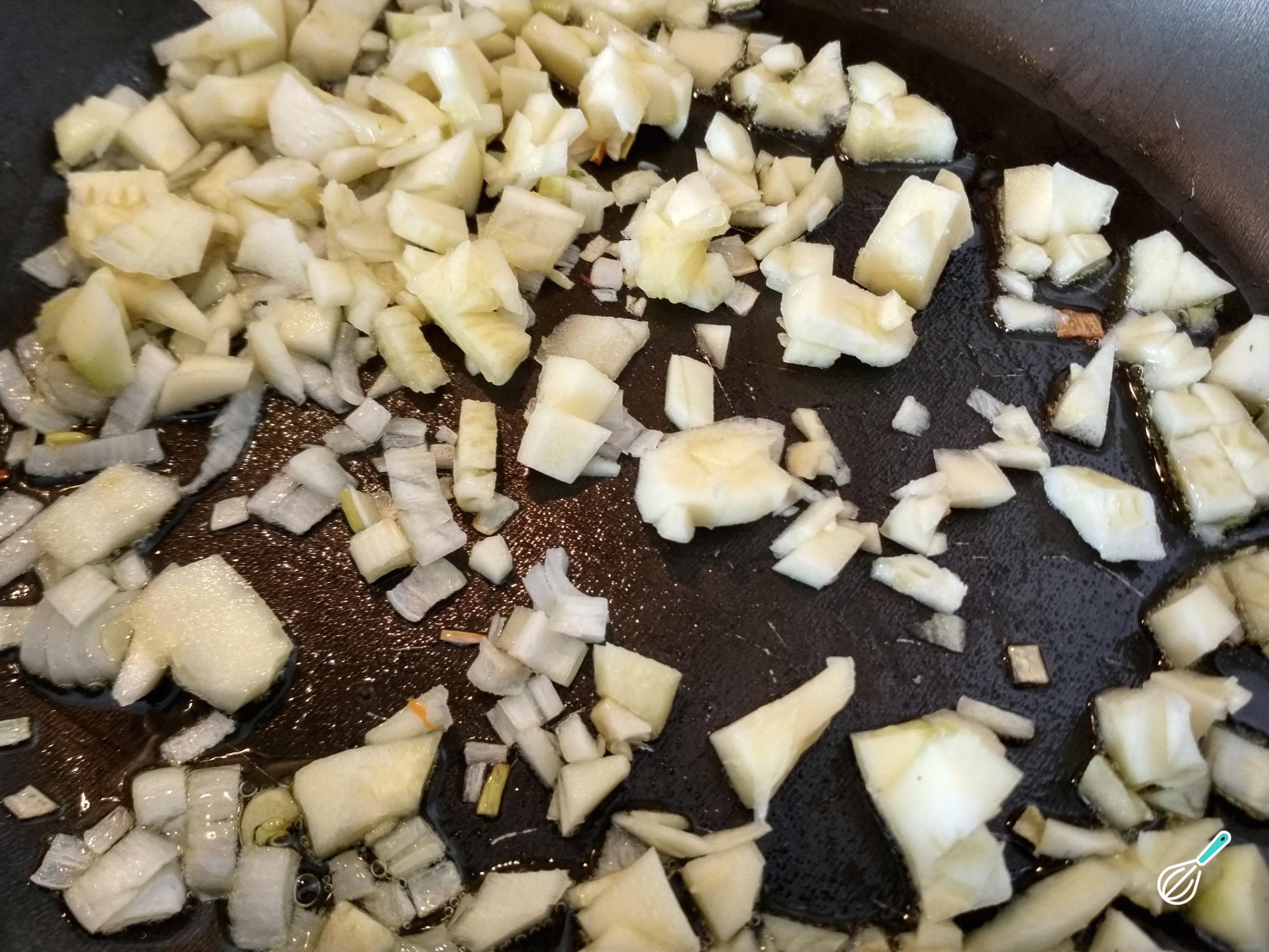 Em uma frigideira, refogue a cebolinha picada juntamente com a abobrinha e um pouco de azeite. Deixe cozinhar durante 3 minutos.
