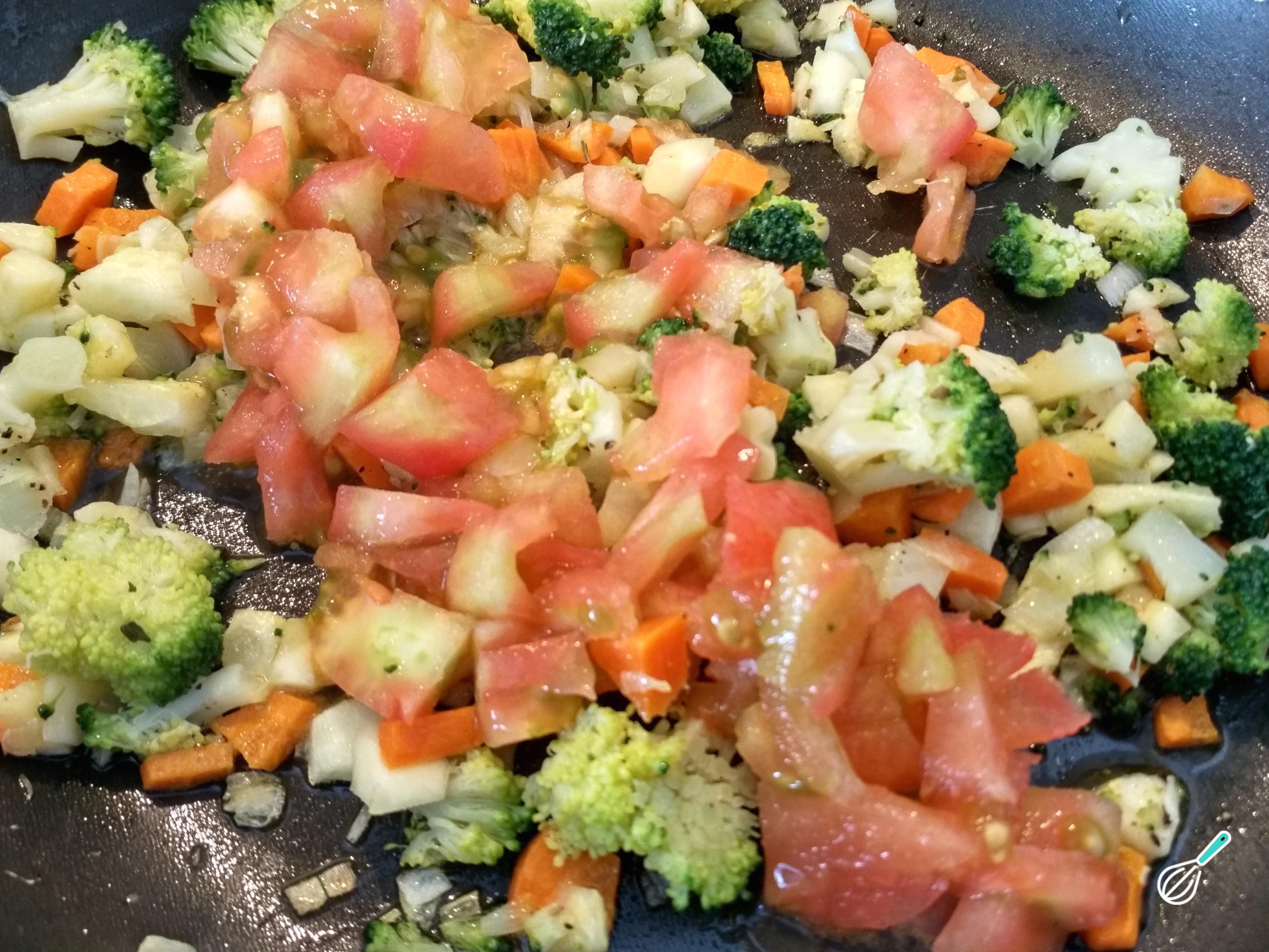 Junte o brócolis previamente cozido e o tomates descascados e picados em pedaços pequenos. Tempere com sal e pimenta e deixe cozinhar por 4-5 minutos.