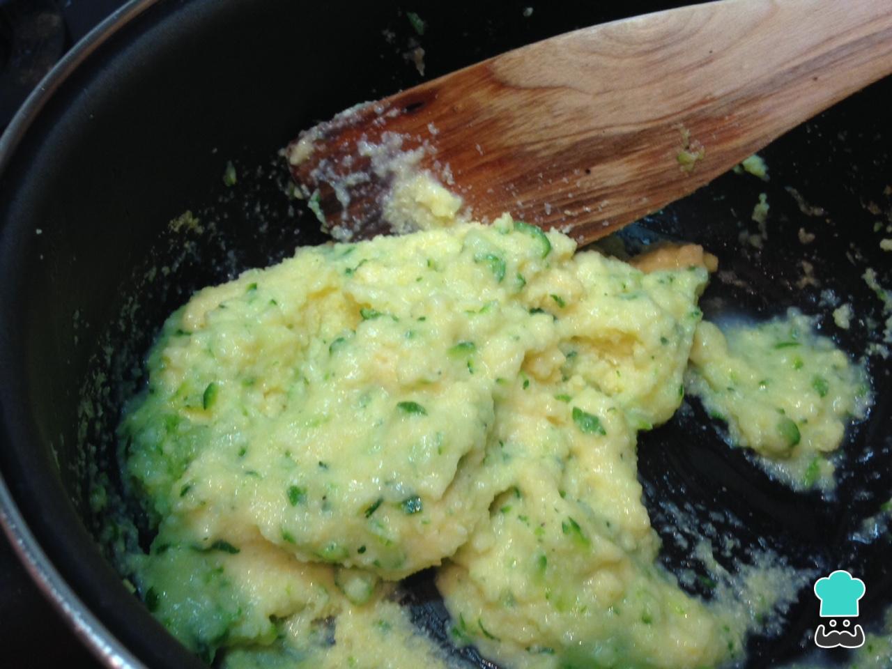 De seguida, amasse bem a abobrinha até os pedacinhos deixarem de ser visíveis. Volte a colocá-la no fogo e junte os ovos e a cebolinha verde. Tempere com glutamato monossódico e sal, deixe cozinhar mais um pouco com a panela tampada e misture de vez em quando.