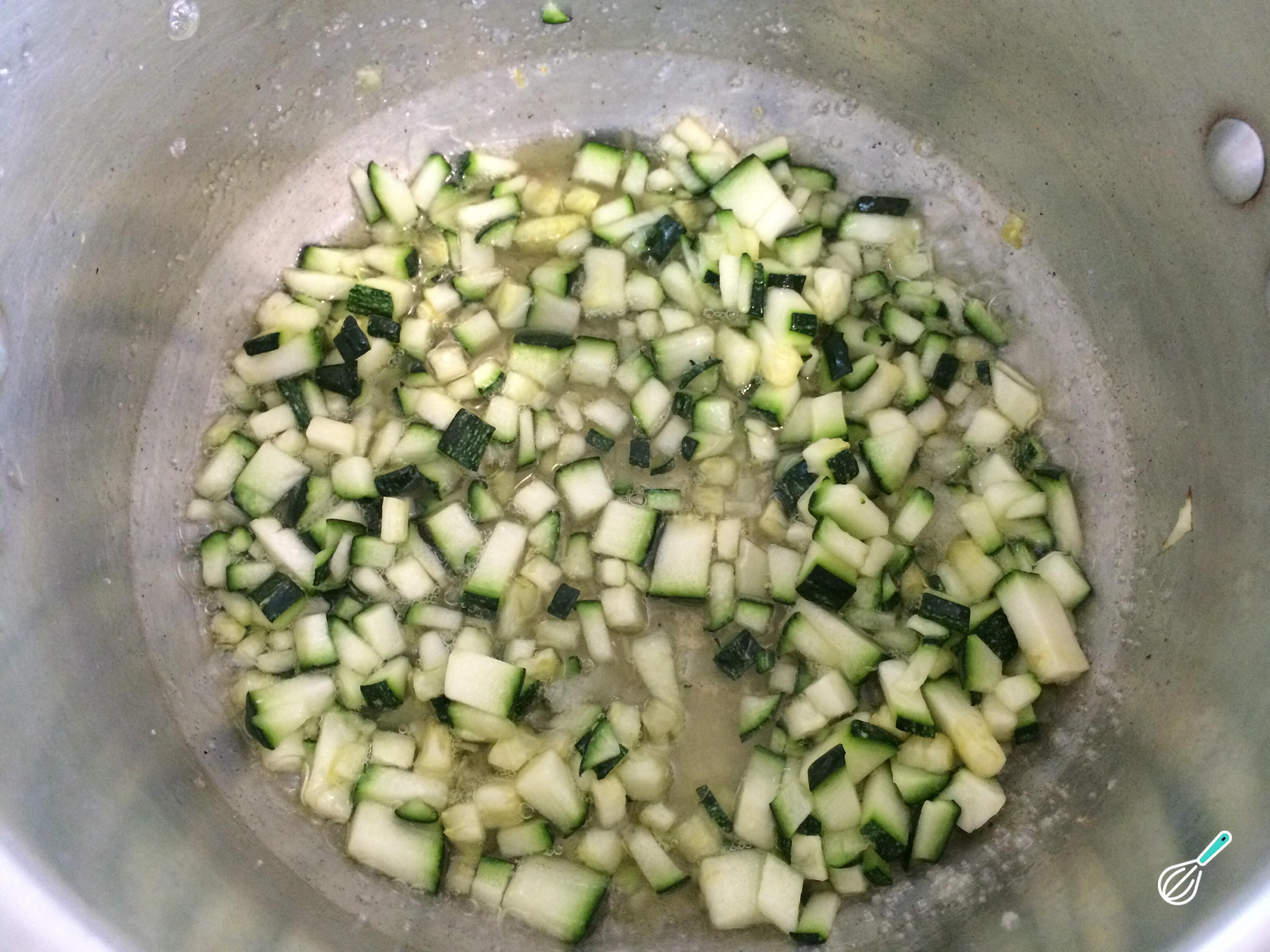 Acrescente a abobrinha e o tomate picados junto a cebola e o alho refogados e coloque um pouco de água (até cobrir os legumes).