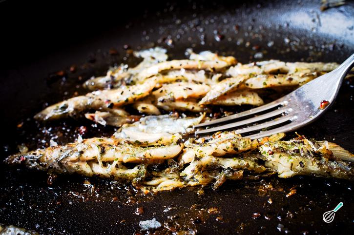 Agora, pegue as sardinhas, tire o ossinho delas e coloque junto com a abobrinha, quando ela já estiver mole e a água estiver secado quase toda. Mexa mais um pouco e jogue a pimenta do reino.