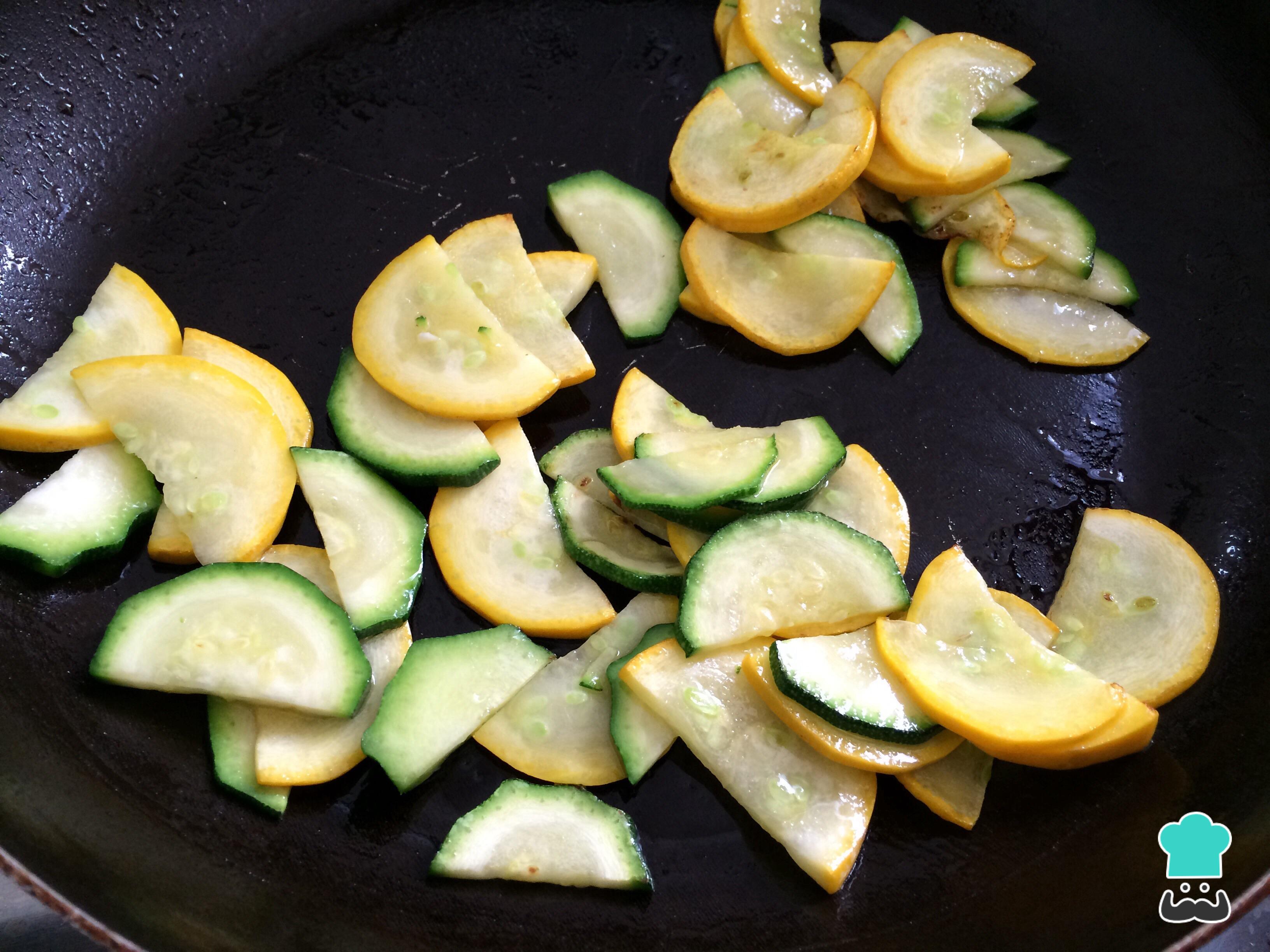 Coloque um pouco de azeite numa frigideira e leve ao fogo médio. Lave e corte as abobrinhas em meias-luas e salteie na frigideira até que amoleçam e dourem ligeiramente.