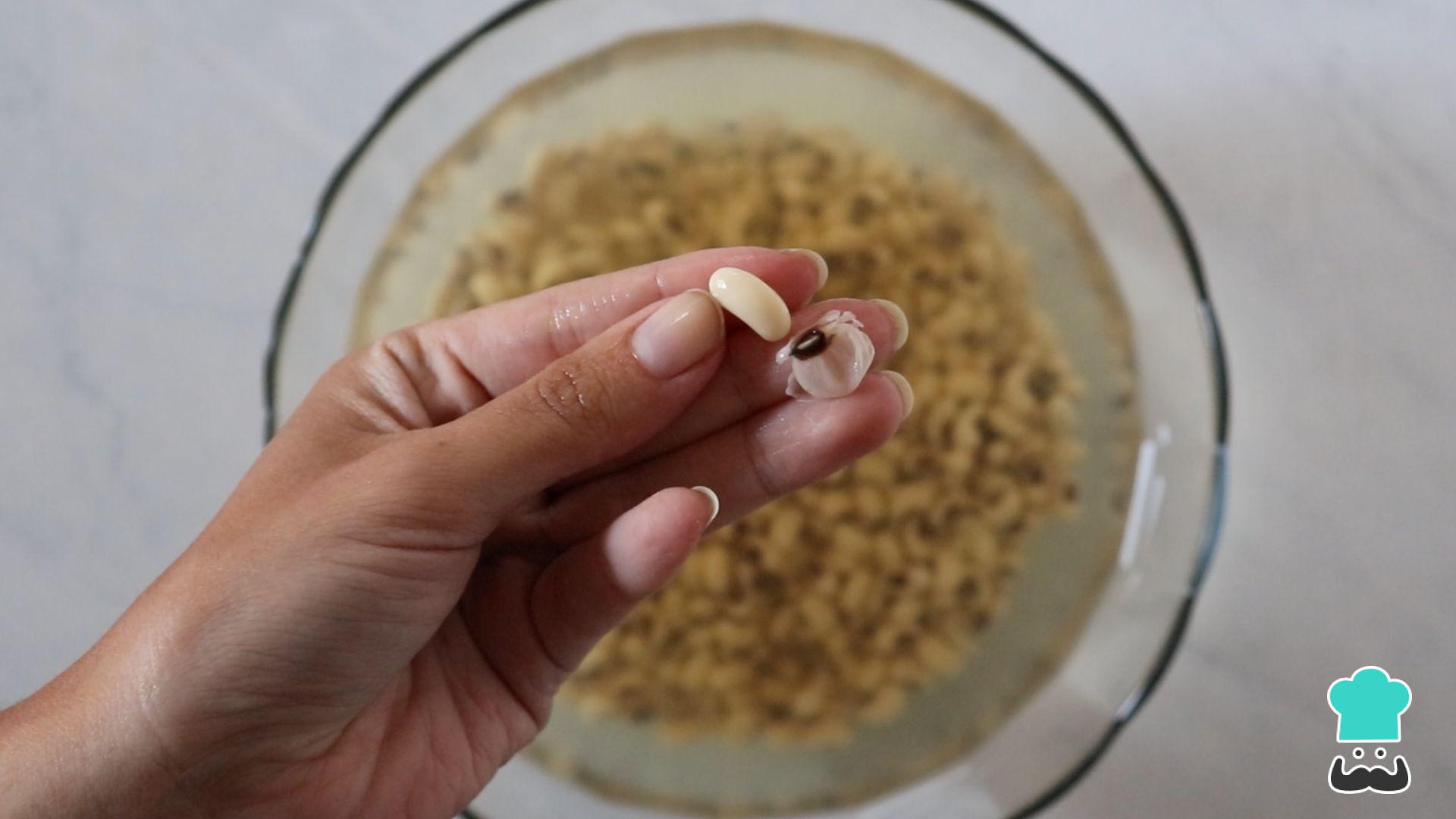 Como disse no início do post, essa receita precisa de planejamento: o feijão tem que ficar de molho por 8 horas. Após esse tempo, tire a casca do feijão e deixe secar por mais 1 hora. Separe ⅓ de xícara de chá da água para usarmos mais adiante na receita.