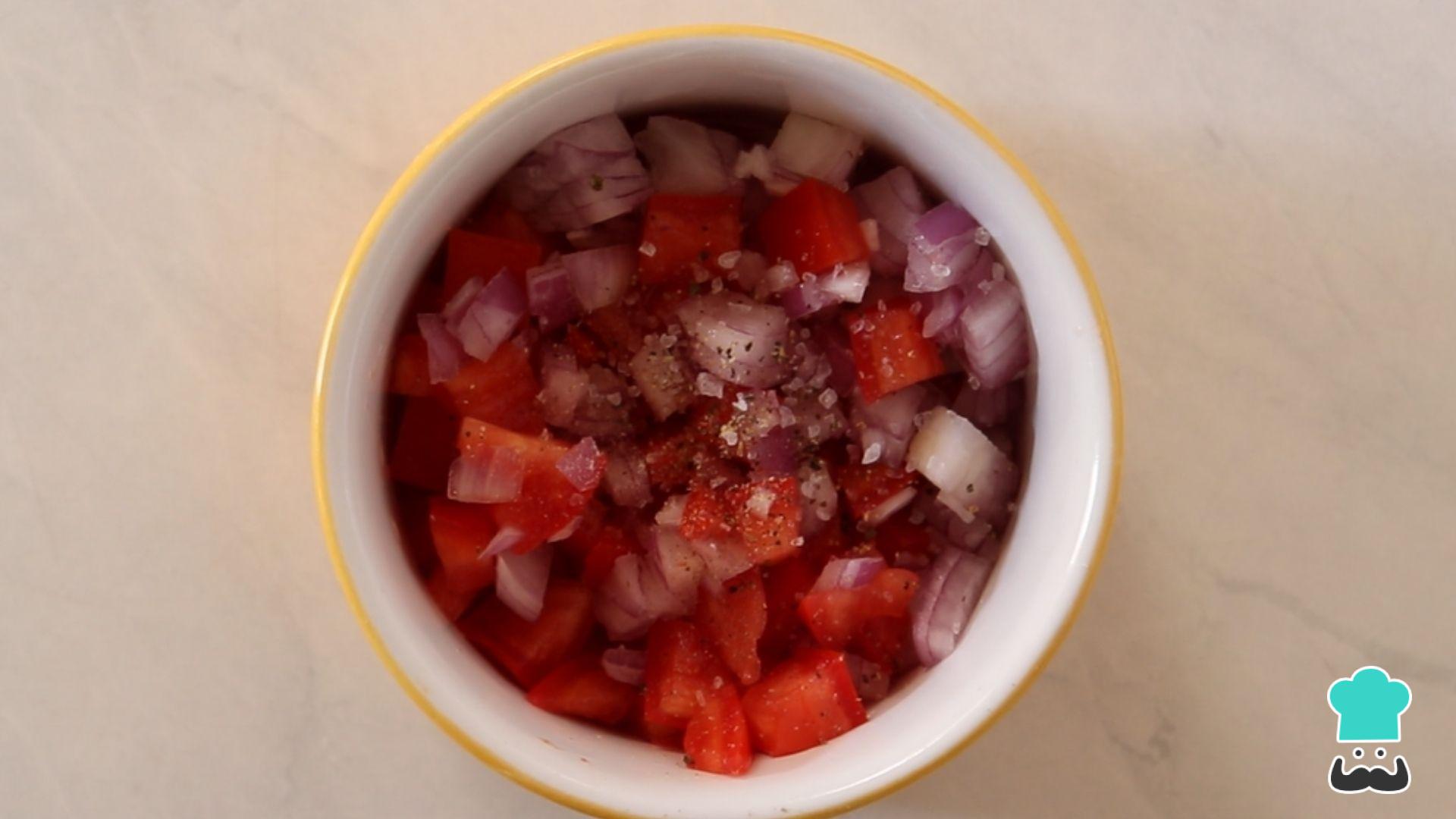 Enquanto isso, corte o tomate e a cebola em cubos.