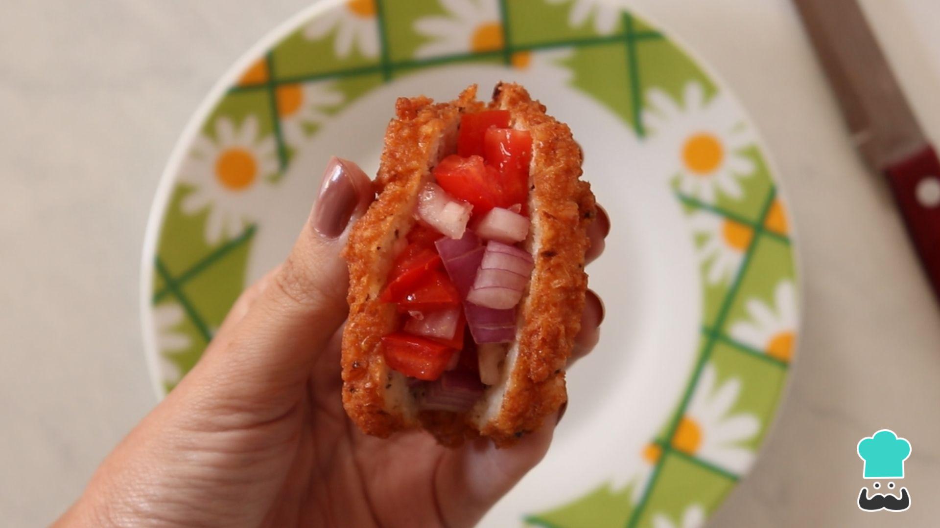 Agora é só cortar o acarajé ao meio e rechear com a saladinha de tomate e cebola.
