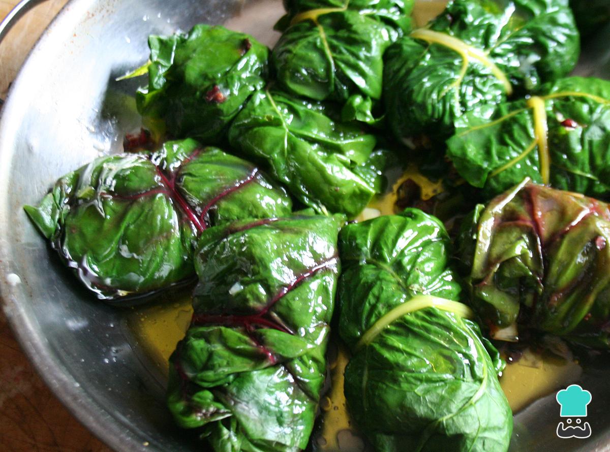 Após o passo anterior, retire as acelgas recheadas e deixe escorrendo um pouco. Depois leve ao fogo médio-baixo uma frigideira com o azeite, adicione as acelgas e cozinhe por mais 2-3 minutos, ou até ficarem ligeiramente firmes.