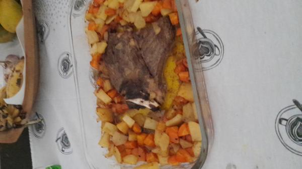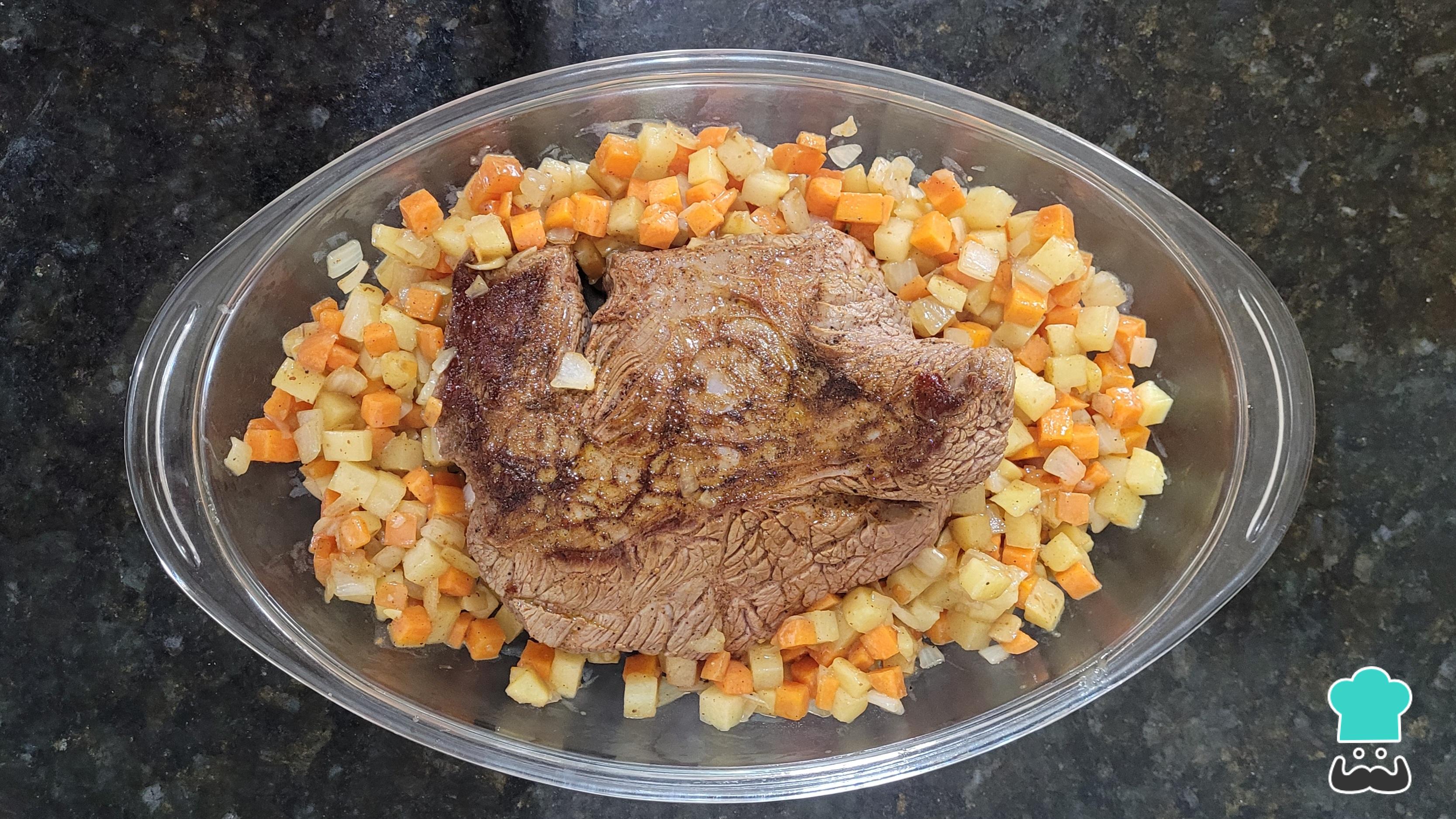 Coloque o acém em uma travessa que possa ir ao forno e disponha os legumes ao seu redor. Lembre-se: você também pode fazer esse acém assado no forno elétrico.