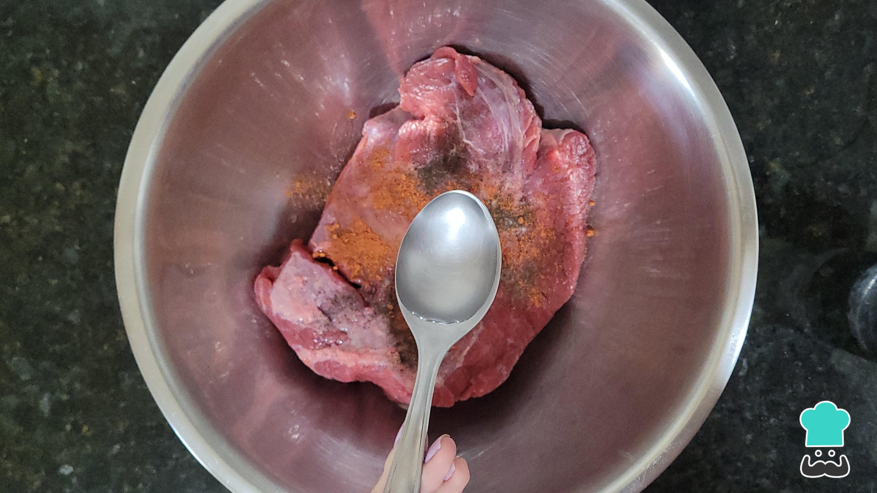 Em um recipiente, coloque o acém, os temperos (sal, pimenta-do-reino, páprica defumada) e o vinagre. Espalhe bem sobre toda a carne e reserve.